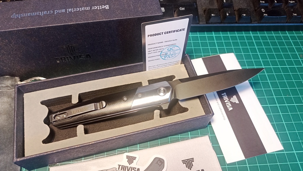 Рукоять ножа Trivisa Leominor имеет основу из стальных лайнеров, один из которых служит замком Liner-Lock, обеспечивая дополнительную прочность и безопасность при эксплуатации. Накладки рукояти выполнены из нержавеющей стали и прочного стеклотекстолита G10, который отличается своей стойкостью к внешним воздействиям и долговечностью. Стальной больстер придает ножу более элегантный и утонченный вид, подходящий для джентльменского использования. Для ношения модель оснастили карманной клипсой, которая позволяет легко закрепить нож на кармане. Так же у модели есть темлячное отверстие для любителей украшать свои ножи темляками