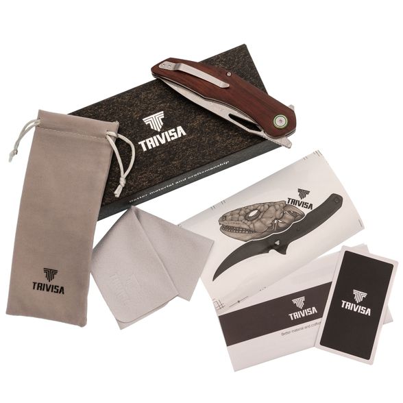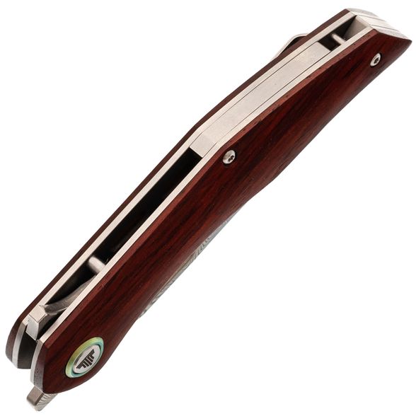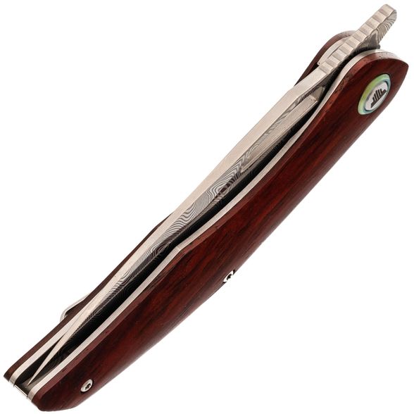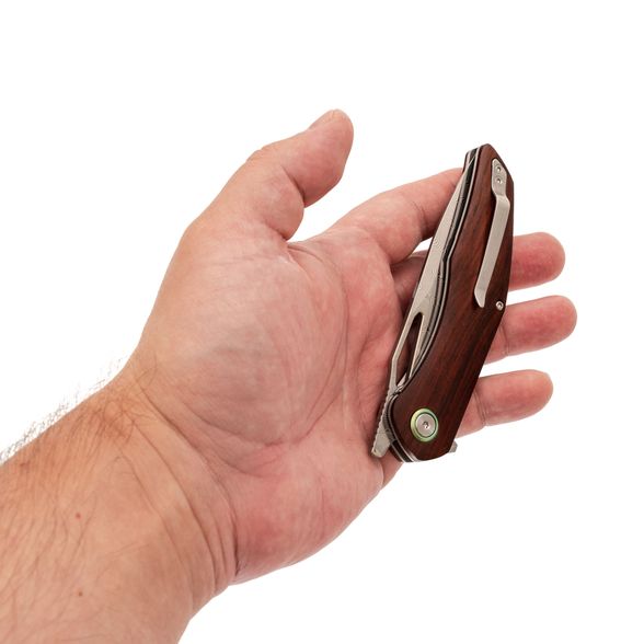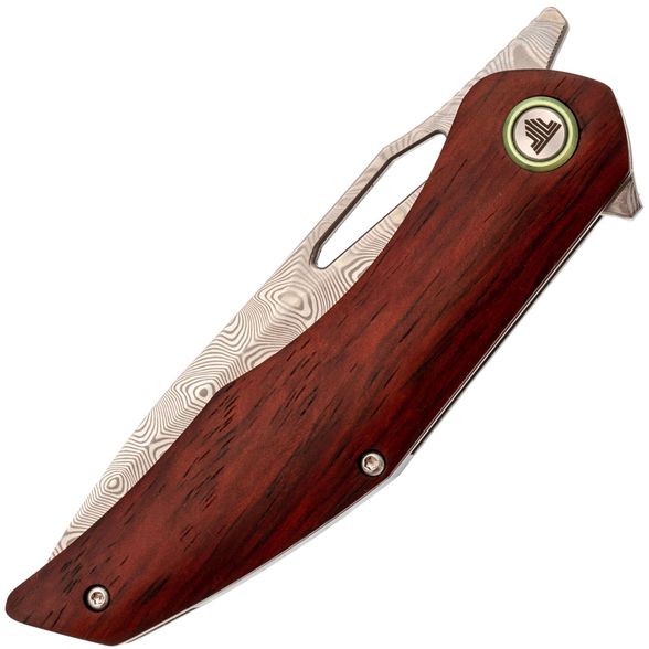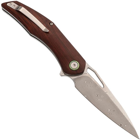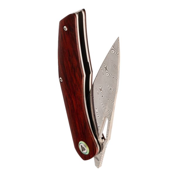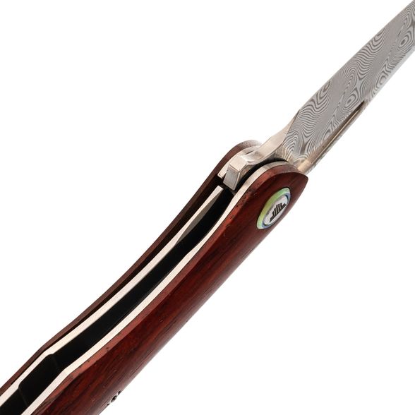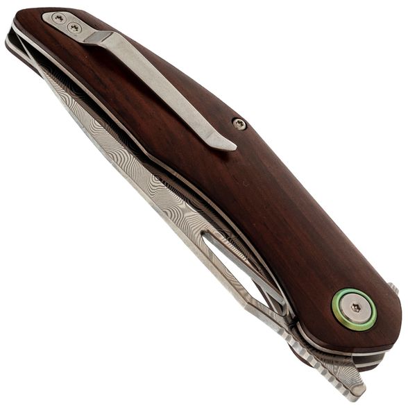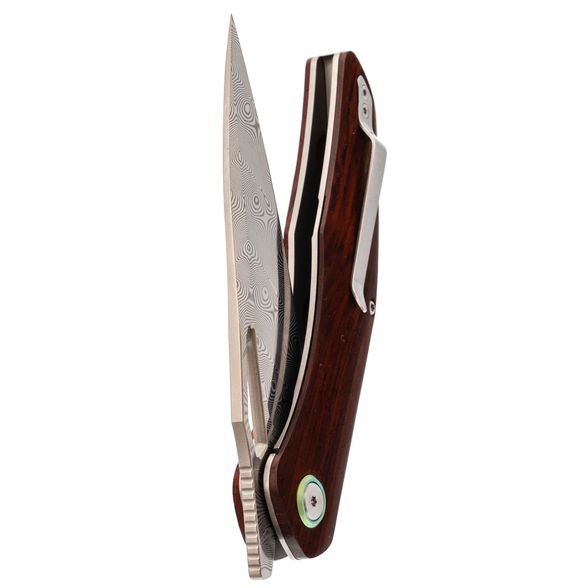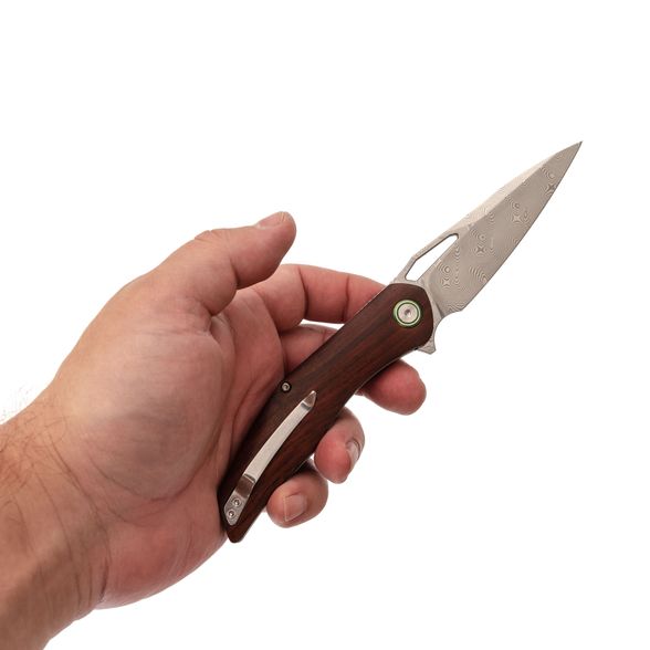 Рукоять изготовлена из ценной древесины Rosewood (палисандр), которая обладает глубоким коричневым оттенком и уникальной текстурой, отличающейся у каждой модели. Это сочетание с дамаском образует гармоничный и изысканный дизайн. Форма рукояти удобно изогнута, что обеспечивает комфортное и надёжное удержание ножа. Присутствует клипса, позволяющая носить нож в кармане, что делает его отличным повседневным инструментом.