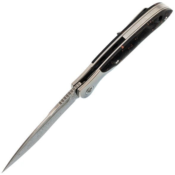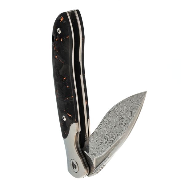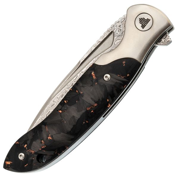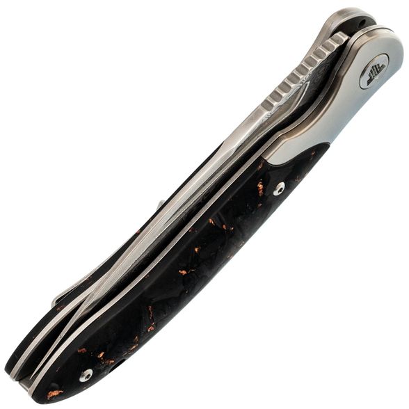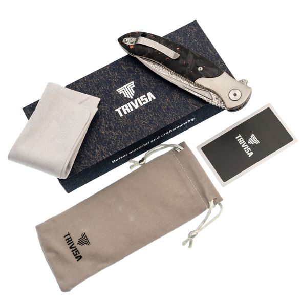 Рукоять ножа Trivisa Virgo имеет потрясающий нарядный вид благодаря использованию титанового больстера, который придает дизайну ножа более формальный и элегантный вид. Накладки выполнены из полимерной смолы, в которой засыпаны карбоновая и медная стружка, создавая уникальный и неповторимый рисунок. Этот дизайн не только выглядит потрясающе, но и обеспечивает надежное сцепление в руке.