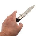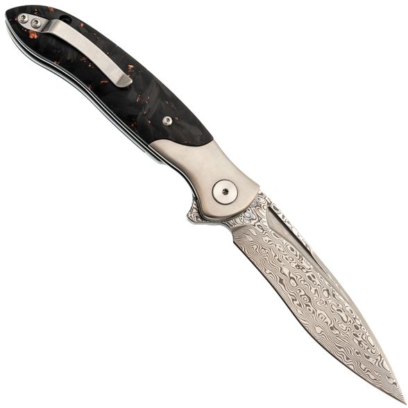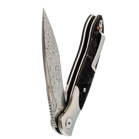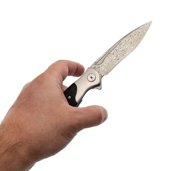 Клинок ножа Trivisa Virgo выполнен из высококачественного дамаска, состоящего из 110 слоев. Этот уникальный материал имеет неповторимый внешний вид, который нельзя сравнить ни с чем другим. Хотя дамаск не обладает некими "сверхспособностями", он обеспечивает отличную устойчивость к коррозии, высокую ударную вязкость и легкость заточки, что делает его идеальным выбором для повседневного использования. Высокие и вогнутые спуски обеспечивают чистый и эффективный рез, а декоративный двухсторонний дол позволяет легко открывать нож.