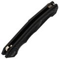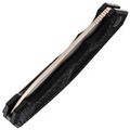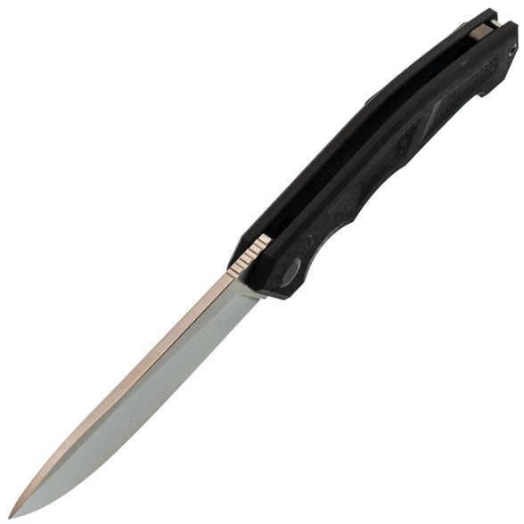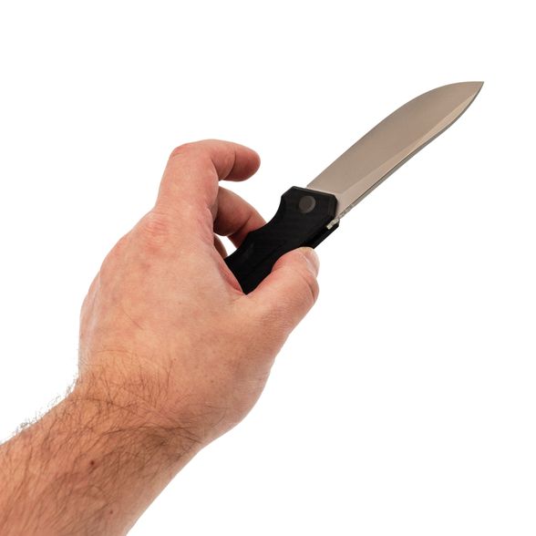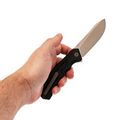 Клинок с профилем Nessmuk хорош там, где нужно много резать: дуга кромки работает как “каток”, помогая идти по материалу ровно и без рывков. Высокие прямые спуски на широком клинке добавляют эффективности по резу и строганию. Плавник обеспечивает быстрое открытие, а в раскрытом положении создаёт упор для пальцев. Дополнительно клинок имеет покрытие PVD - оно помогает дольше сохранять опрятный вид и проще переживает следы эксплуатации.