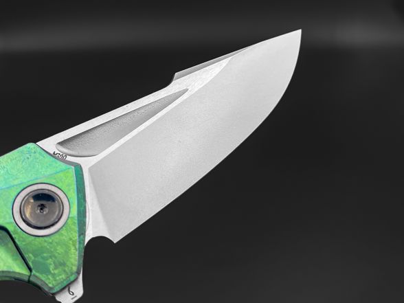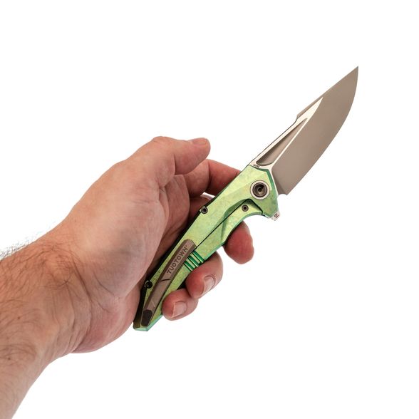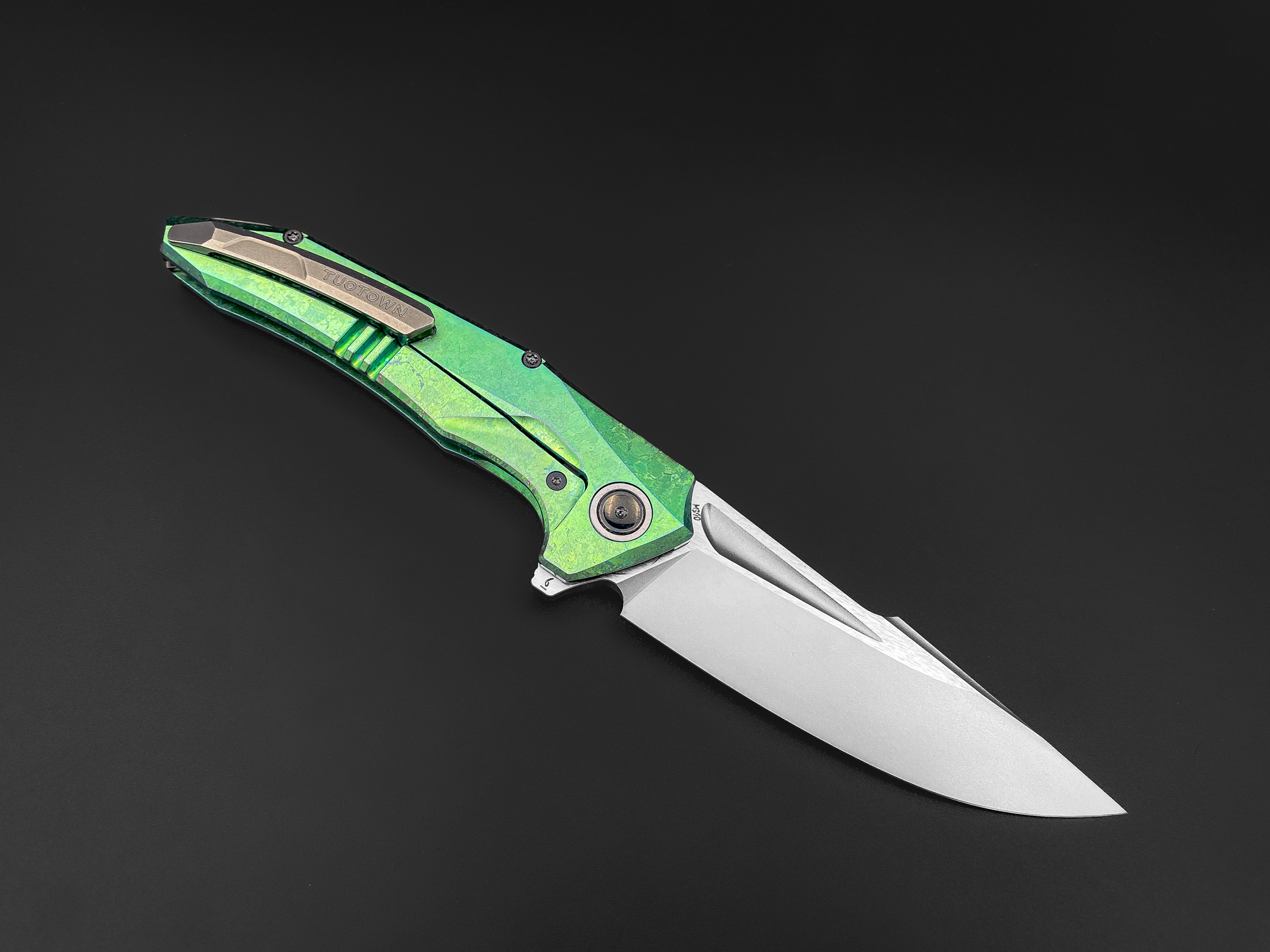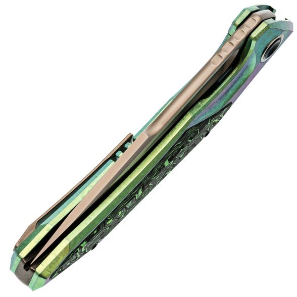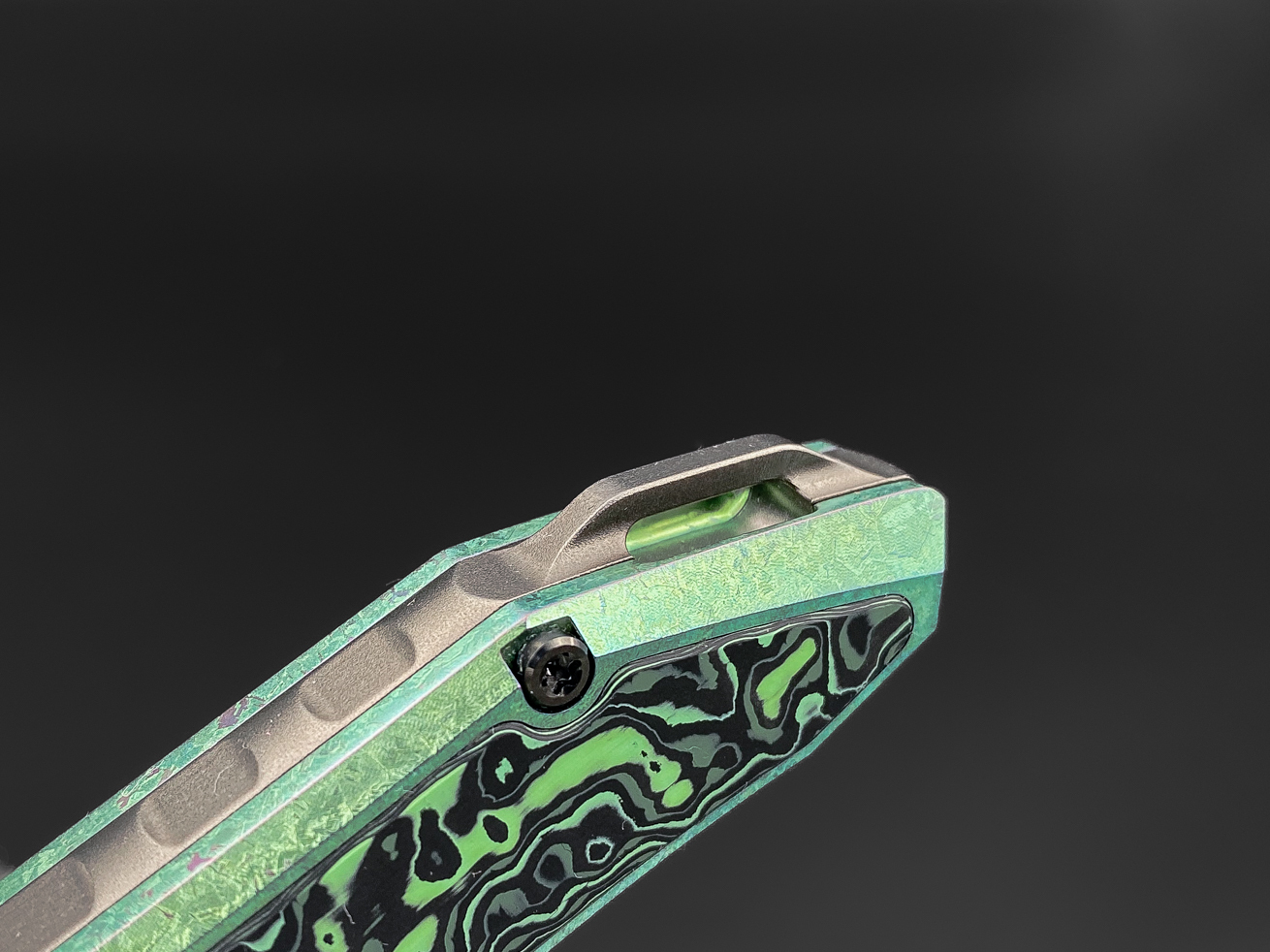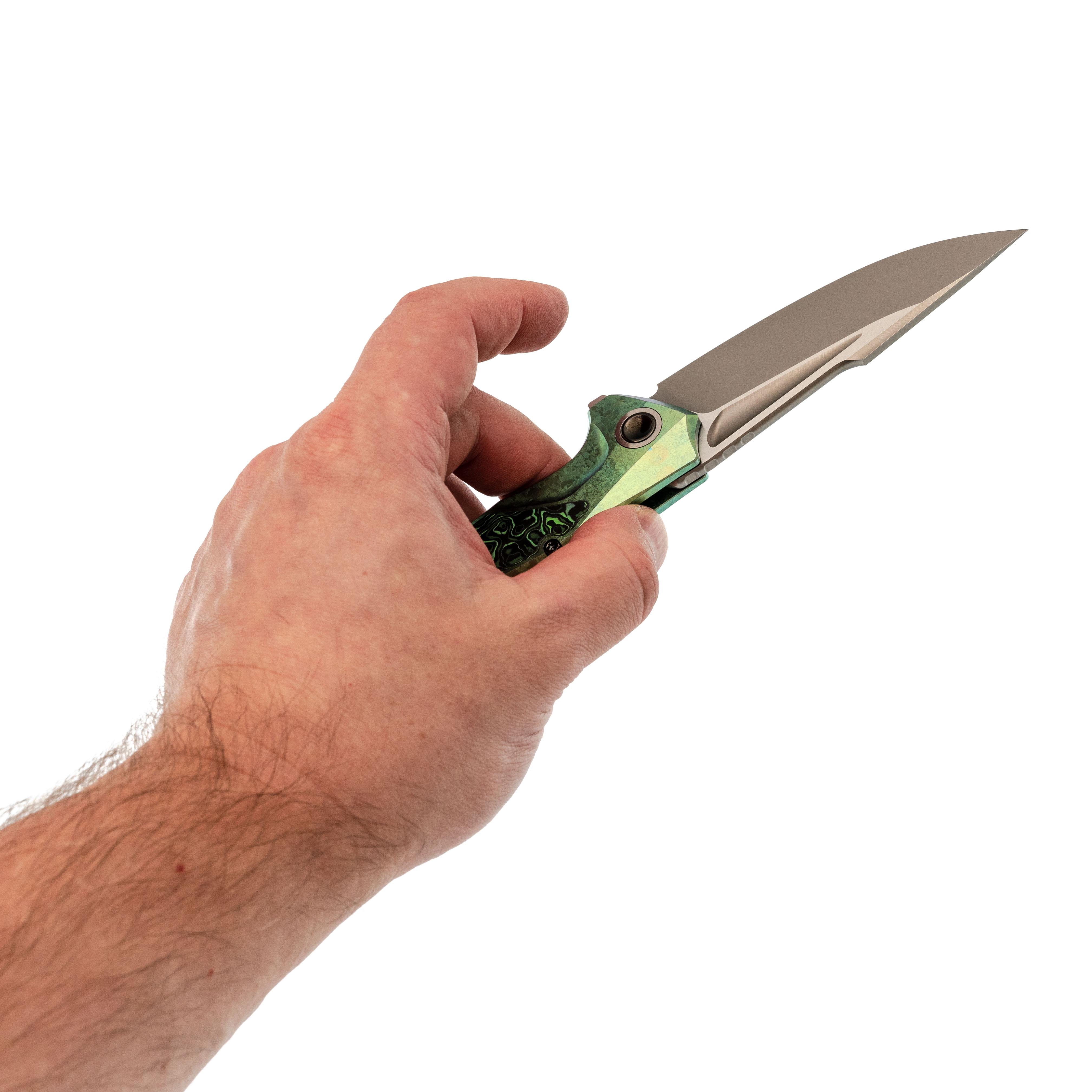Рукоять из анодированного зелёного титана не только красива, но и функциональна. Эргономика продумана - изгиб ложится в ладонь естественно, упор под палец гарантирует уверенный хват. Клипса выполнена из титана, цельнофрезерованная, прочная. Отверстие под темляк добавляет практичности. Guerrero объединяет эстетику и надёжность - редкое сочетание, которое ценят знатоки.