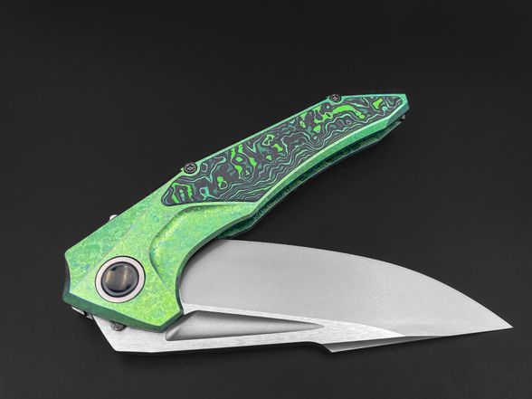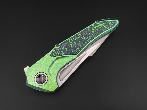 Анодированный кристаллический титан - прочный, лёгкий и эффектный. Зелёное анодирование подчёркивает естественную текстуру металла, создавая уникальный перелив цвета.
