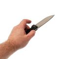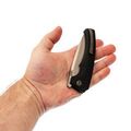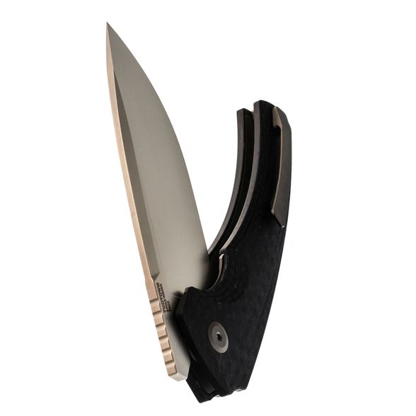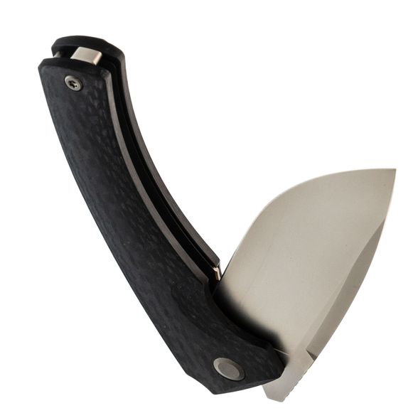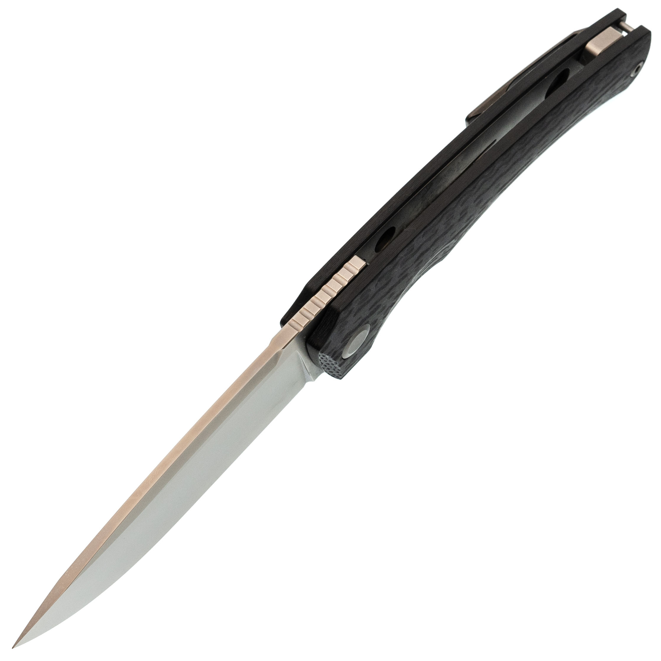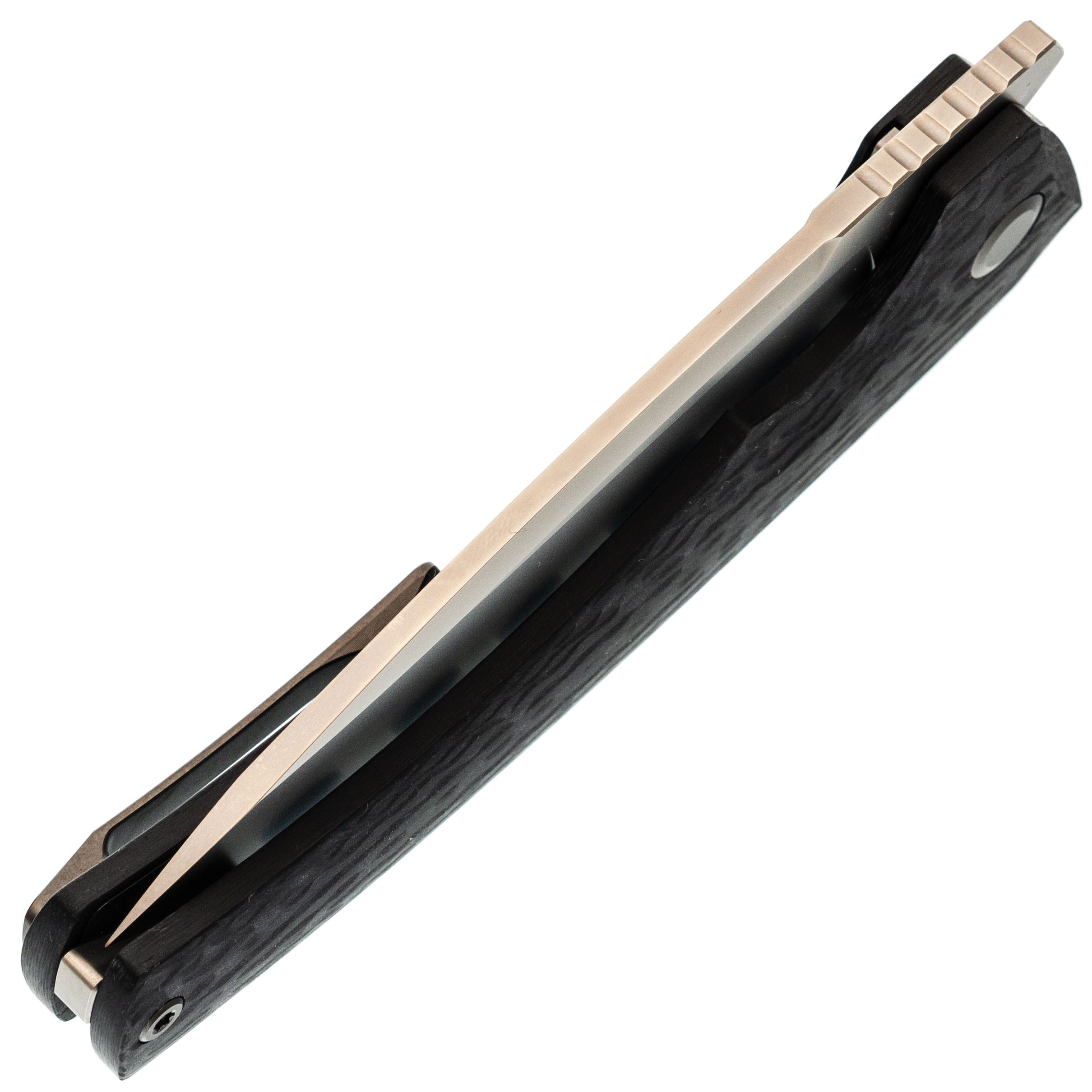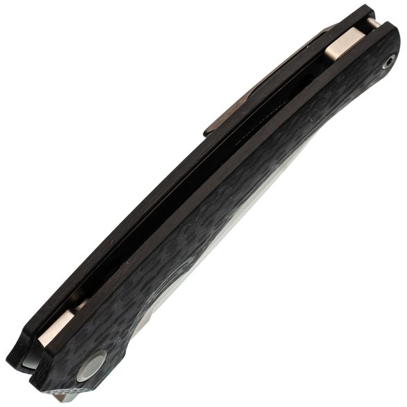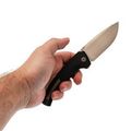 У Kurakh широкий клинок с классическим профилем Drop-Point и прямыми спусками. Такая геометрия даёт приятный, "липкий" рез и удобный контроль кончиком при более тонких задачах. Сталь T10S спокойно выдерживает повседневную нагрузку, а Front Flipper позволяет вывести клинок в рабочее положение коротким движением большого пальца вдоль обуха - быстро и без лишнего шума.