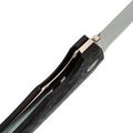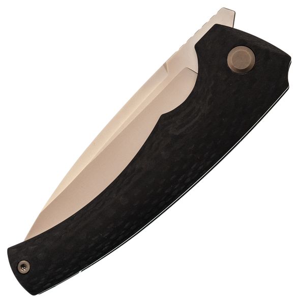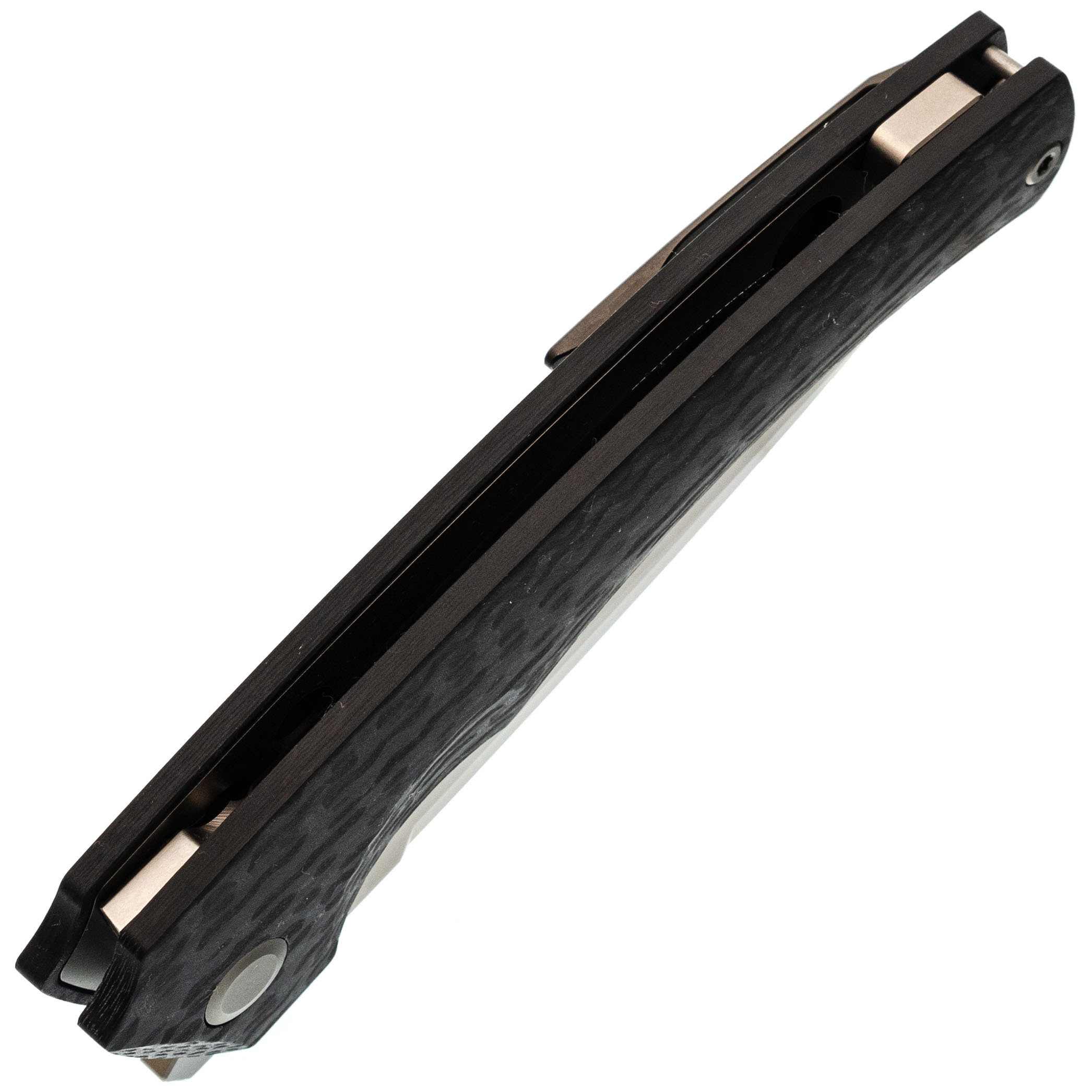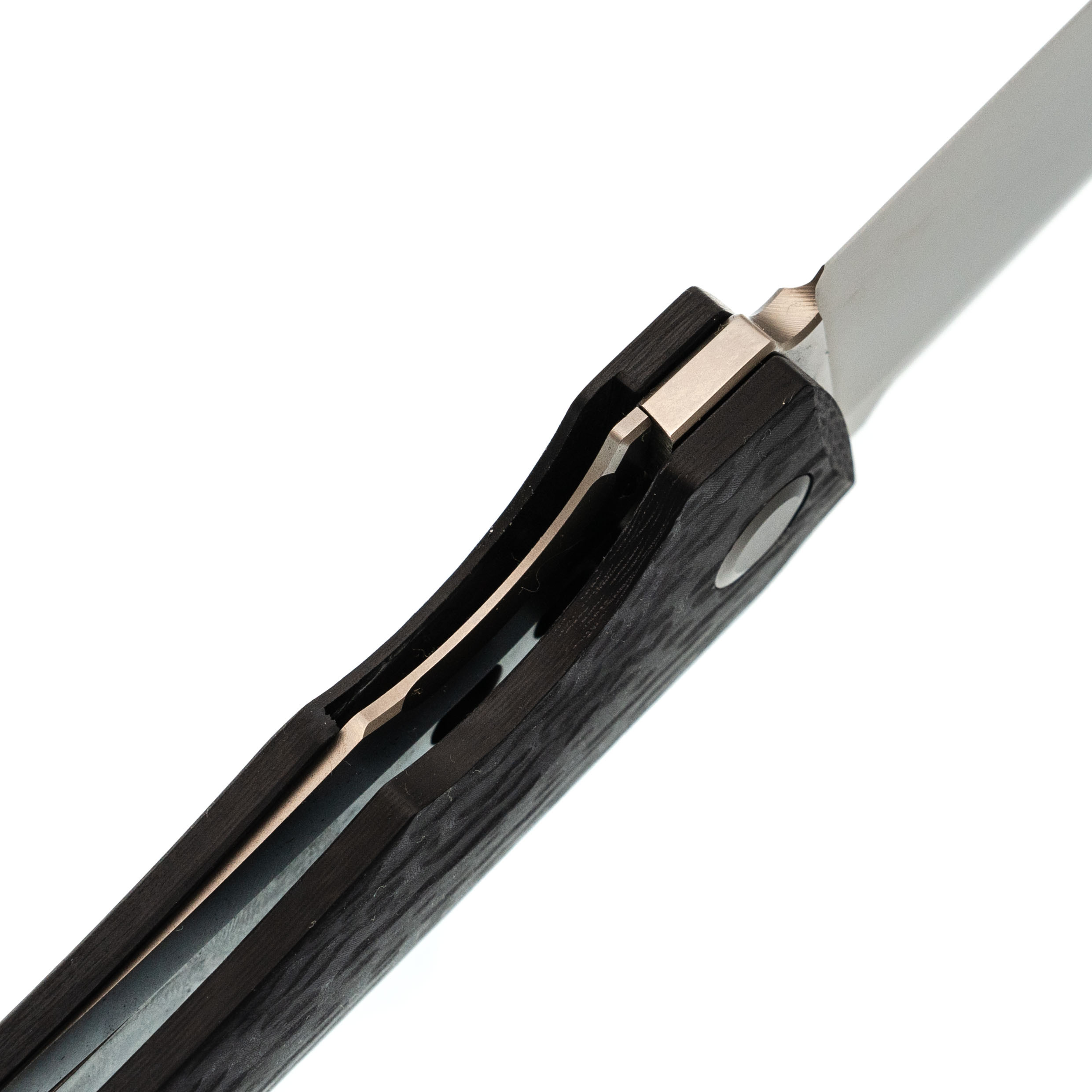 Торцевой G10 на рукояти. Прочный композит, которому не страшны влага, перепады температуры и удары. Торцевой рисунок визуально напоминает карбон и добавляет ножу аккуратный, современный внешний вид, при этом остаётся цепким в ладони.