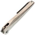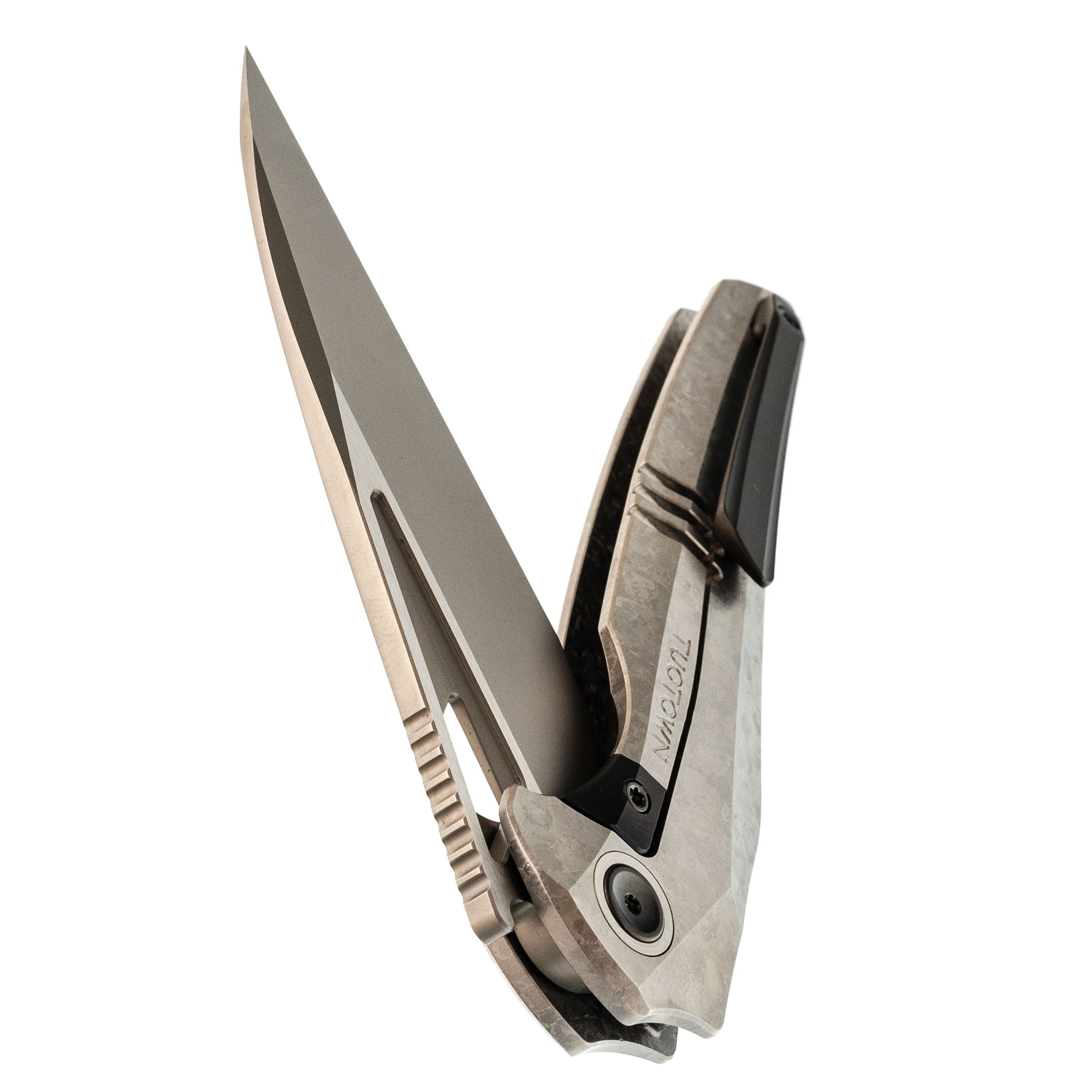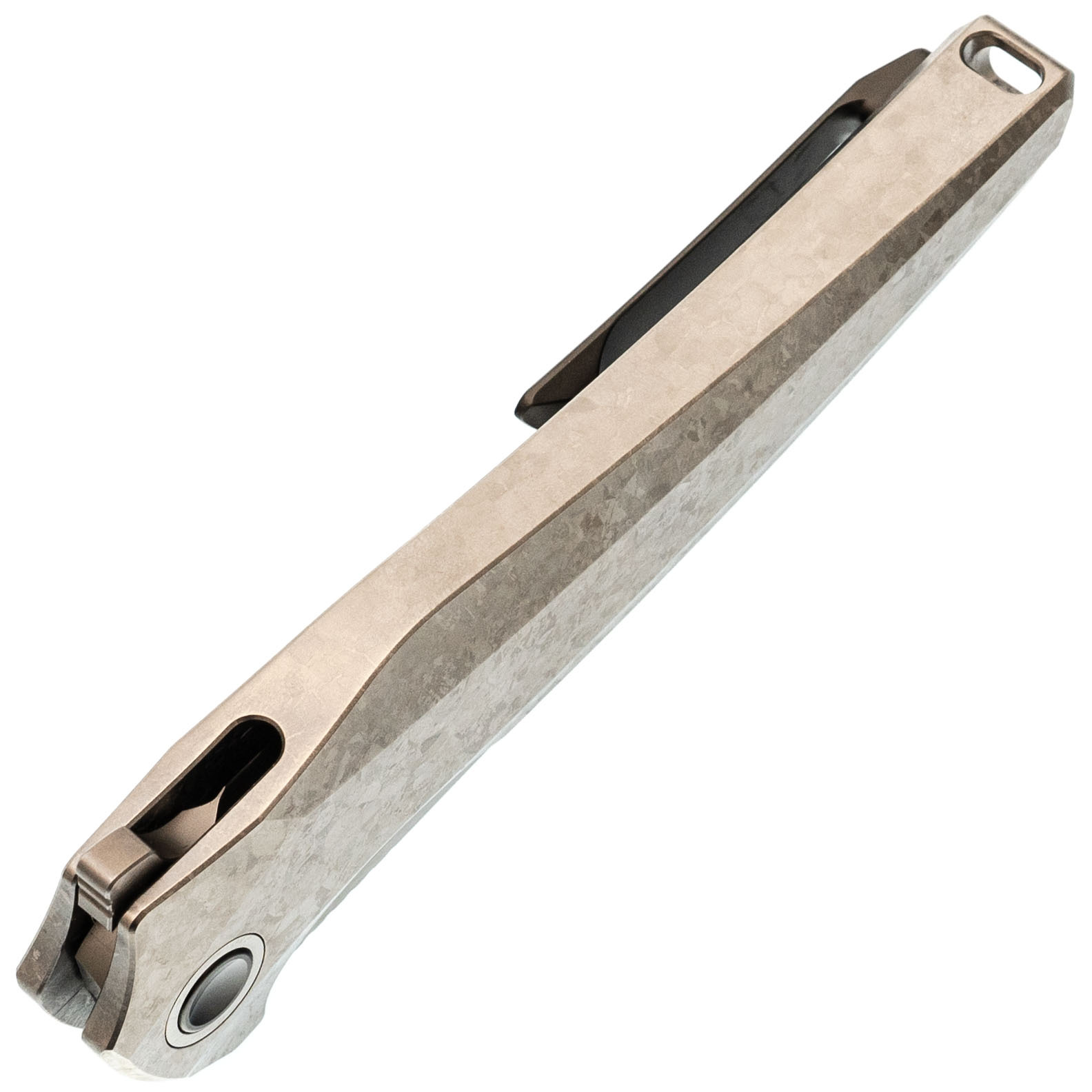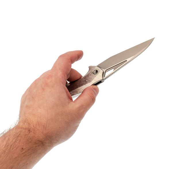 Серебристый титан подчёркивает технологичный характер модели и отлично сочетается с любой одеждой - от офисной до туристической. Геометрия рукояти нестандартная, с заметным изгибом и фасками, из-за чего нож ощущается особеннo и сразу запоминается в хвате. Интегральное исполнение из одного куска титана делает конструкцию жёсткой и долговечной. Цельнофрезерованная карманная клипса сохраняет общую линию дизайна, а аккуратное отверстие под темляк позволяет добавить хвостик из шнура, чтобы Magpie было проще находить и доставать из кармана или рюкзака.