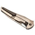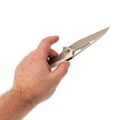 Прямолинейная кромка позволяет задействовать все 100% длины клинка при резе. Удобно подрезать, строгать, чисто снимать материал без необходимости сильно менять угол. Остриё контролируемое, подходит для точечных работ. Открывание - либо динамичный выброс за флиппер, либо уверенный выход за продолговатое отверстие в клинке, в зависимости от ситуации и настроения владельца.