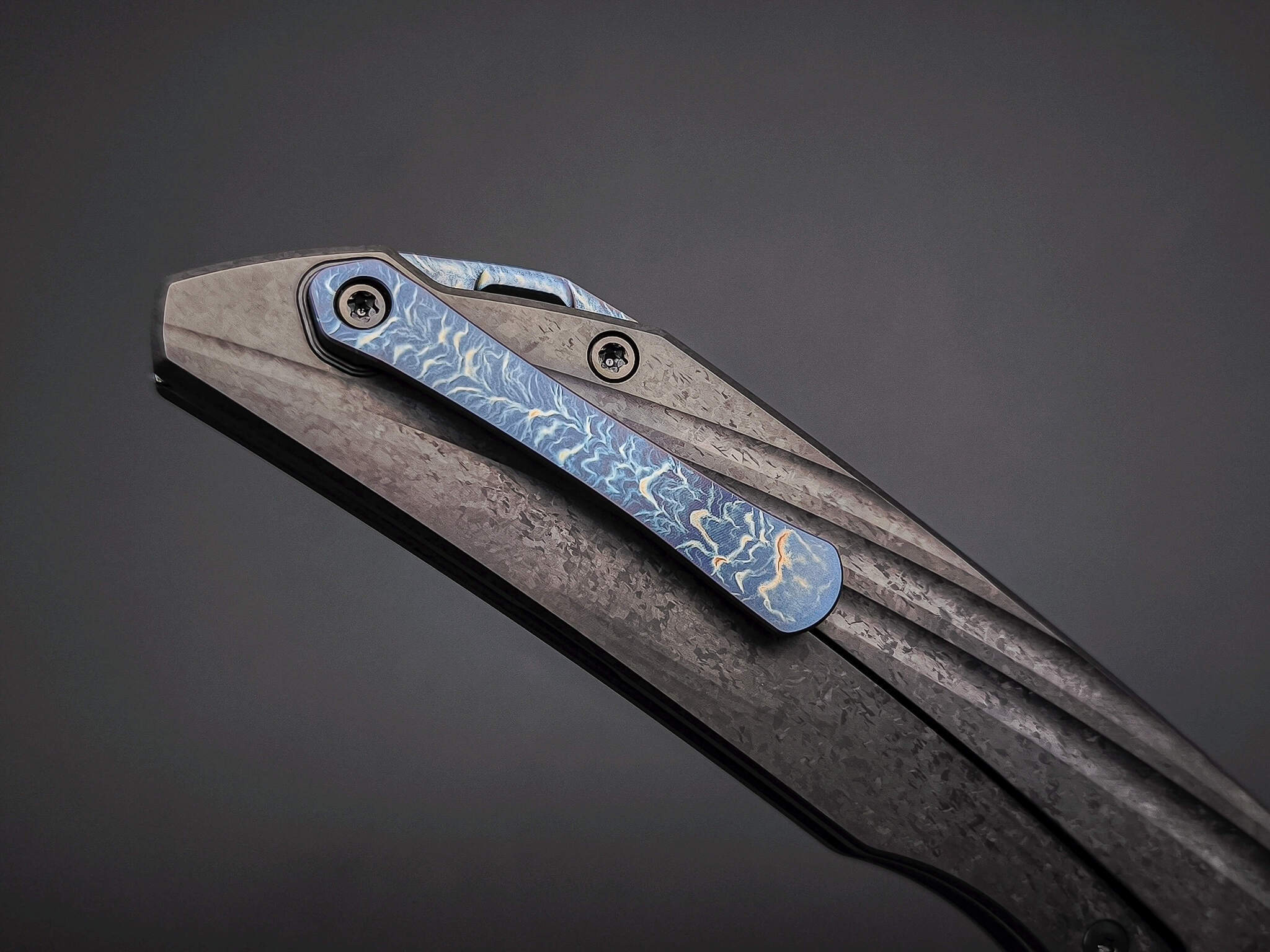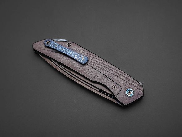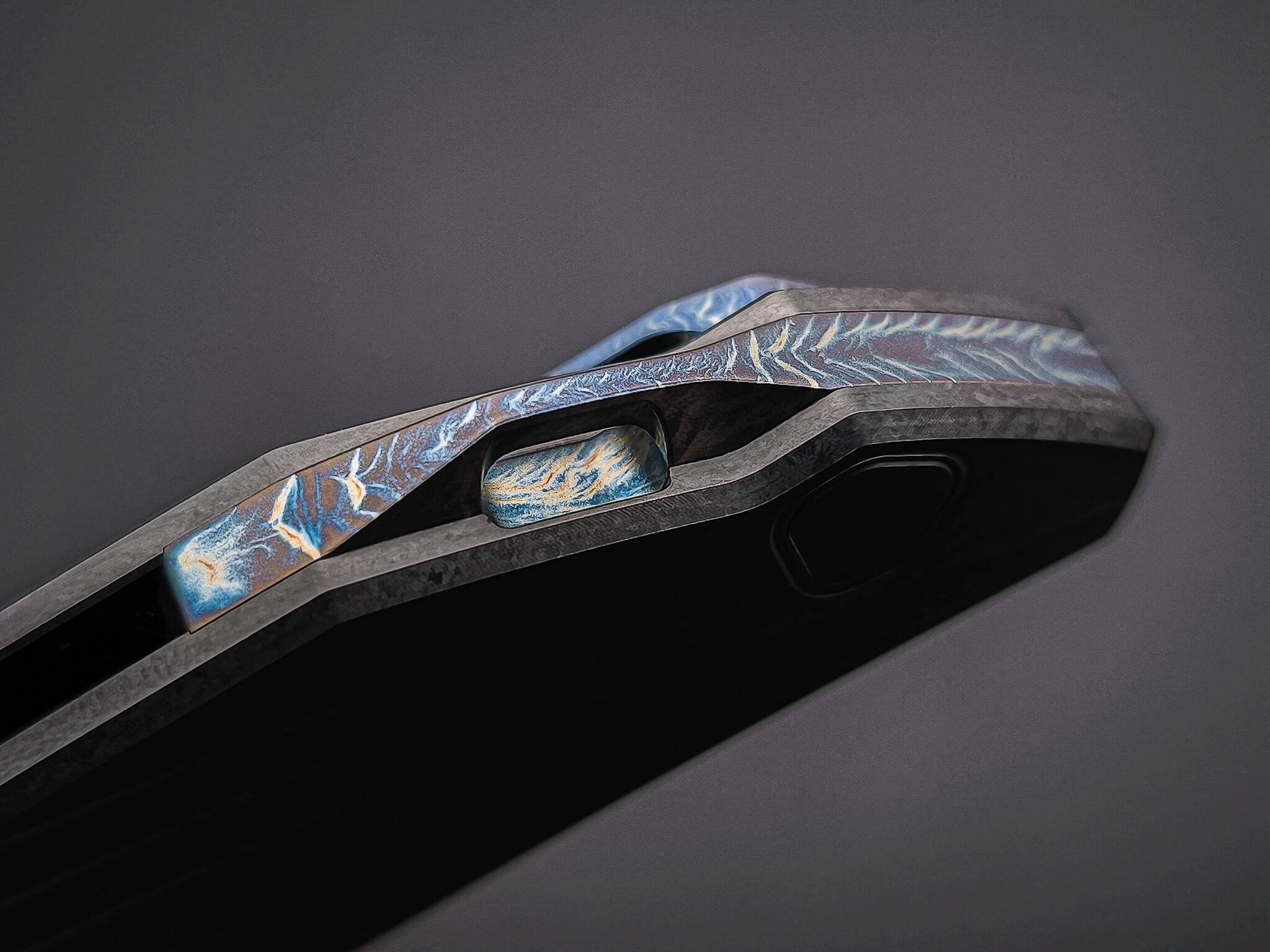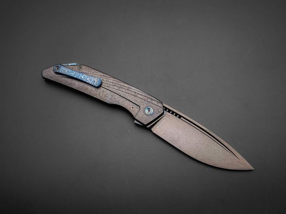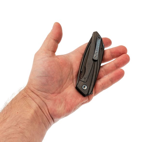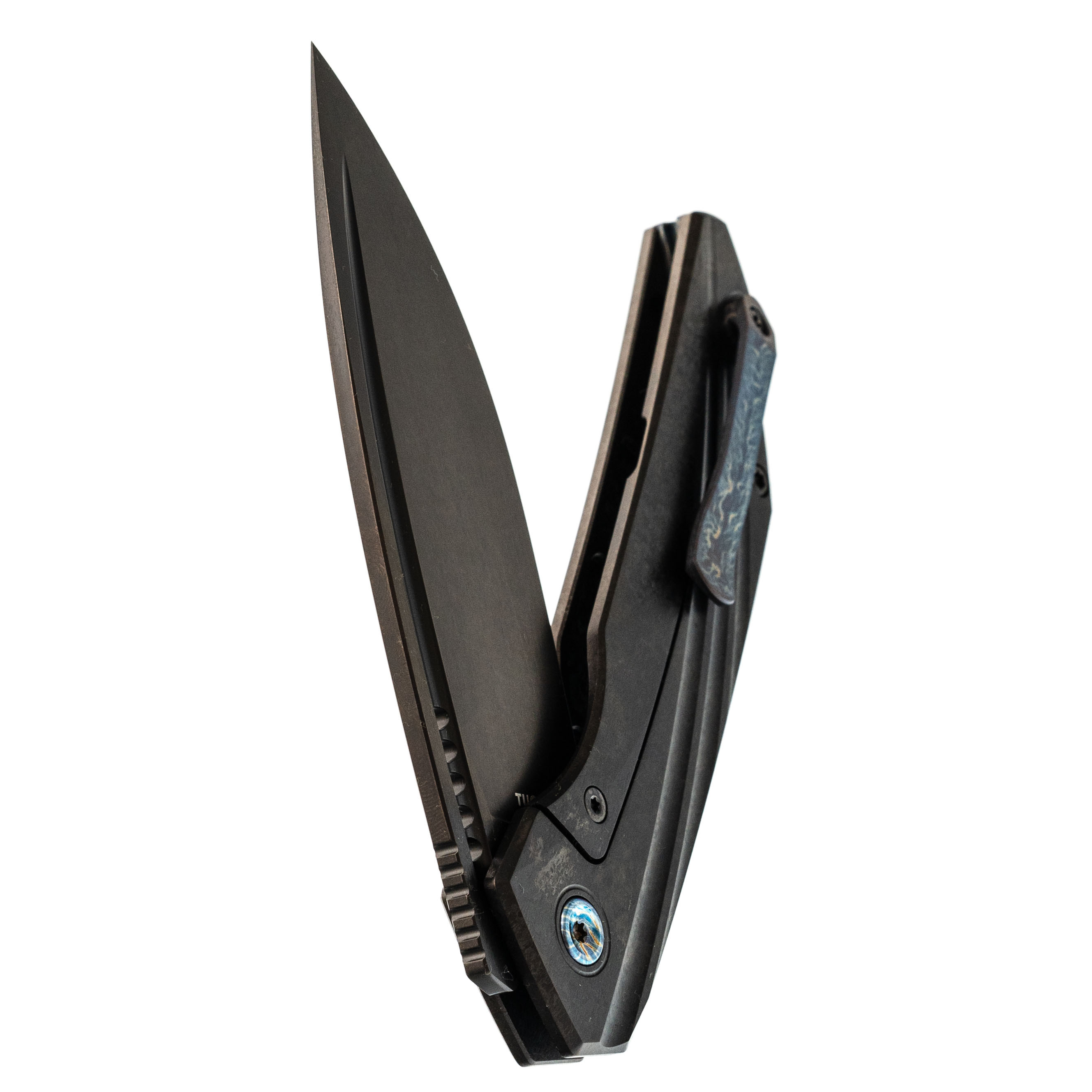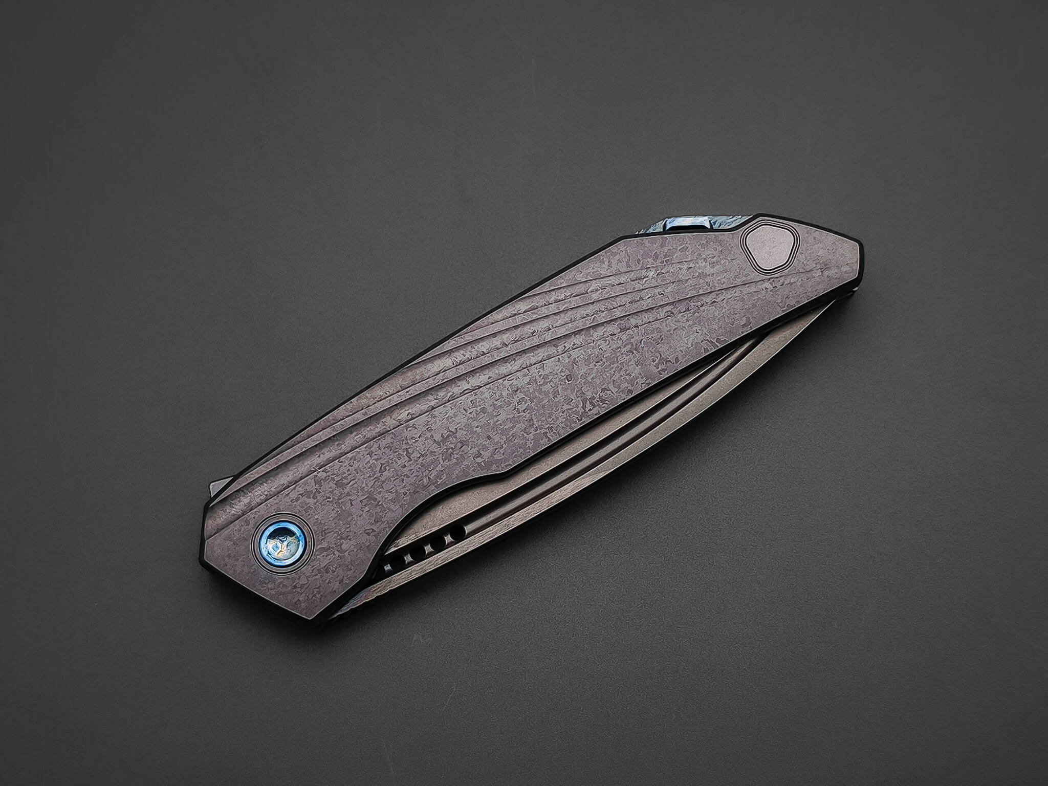 Рукоять выполнена из цельного куска титана - точная фрезеровка создаёт современный, футуристичный силуэт и приятную эргономику. Замок Frame-Lock надёжно фиксирует клинок, выдерживая серьёзные нагрузки. Цельнофрезерованная клипса уверенно держит изделие на кармане, а в бекспейсере предусмотрено отверстие для темляка.