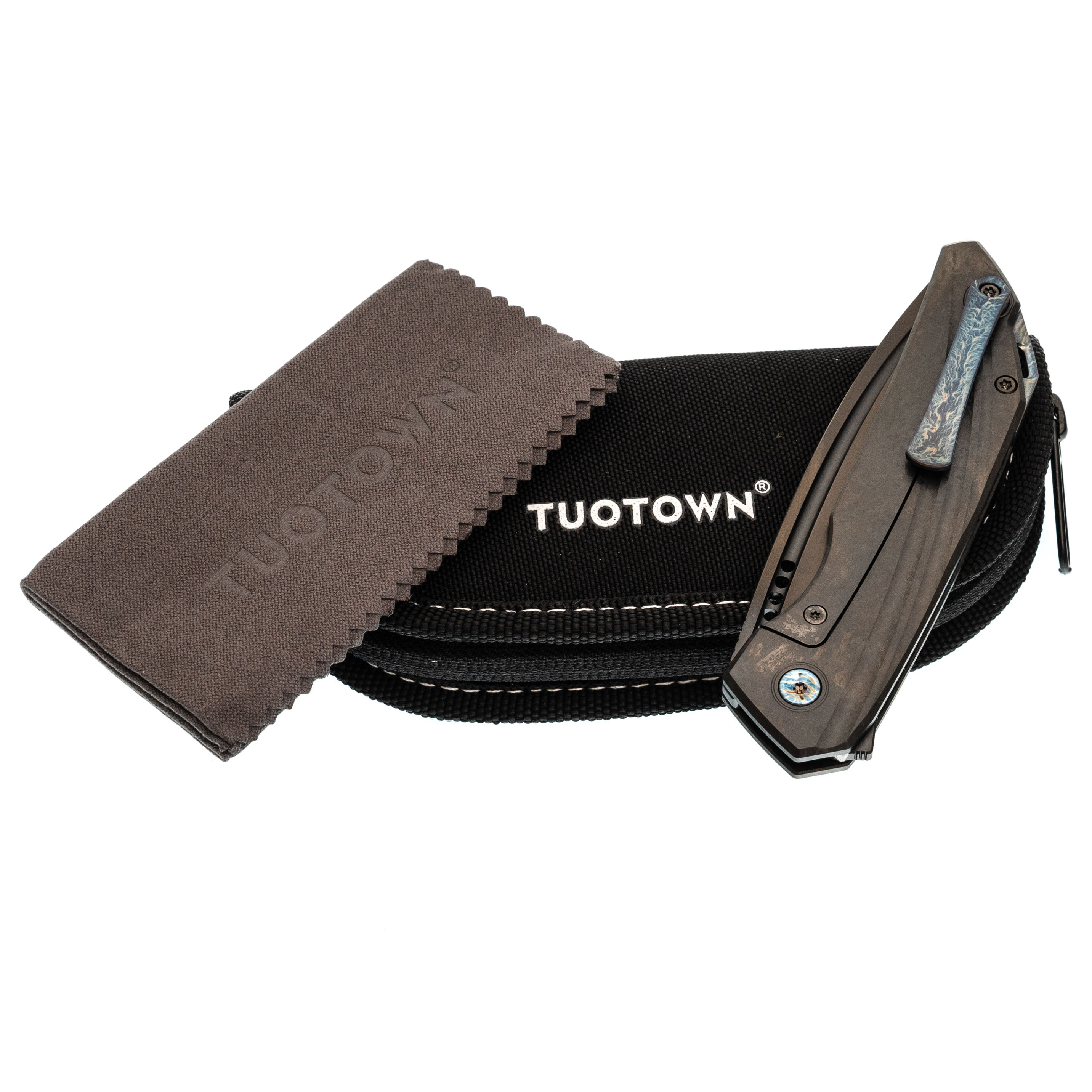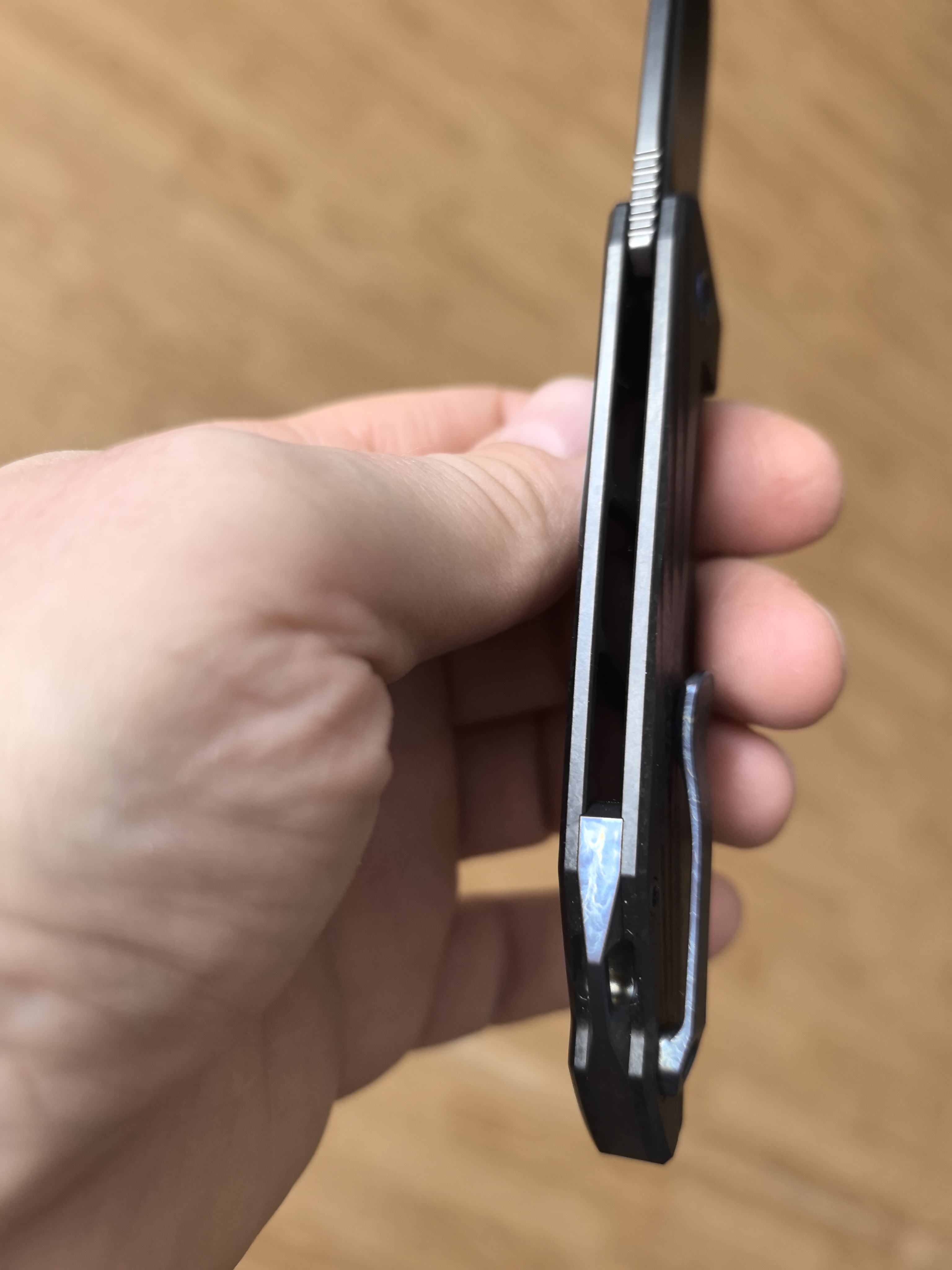 Тимаскус. Из этого материала выполнены клипса, бекспейсер и осевой. Тонкий, неяркий узор придаёт строгому чёрному облику ножа аккуратный штрих индивидуальности.