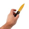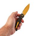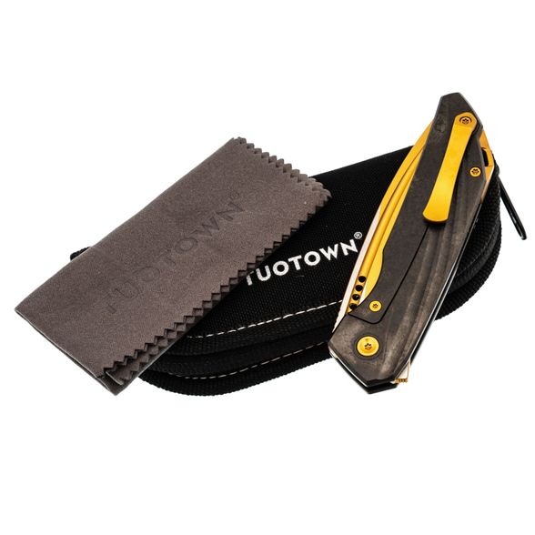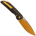 RT-Stinger от TuoTown - это среднеразмерный складной инструмент для тех, кто любит технологичные вещи без лишнего шума. Внешность у него запоминающаяся: черная рукоять и золотистый клинок выглядят как деталь от летательного дрона или компактного аппарата будущего. Формы строгие и продуманные, модель легко вписывается и в городской EDC-набор, и в снаряжение для выездов на природу.