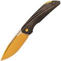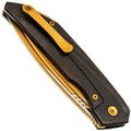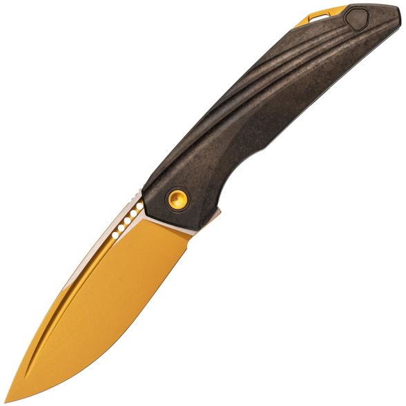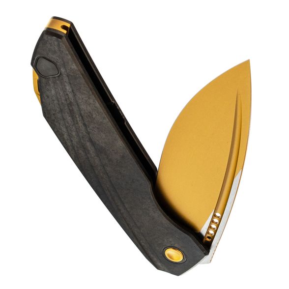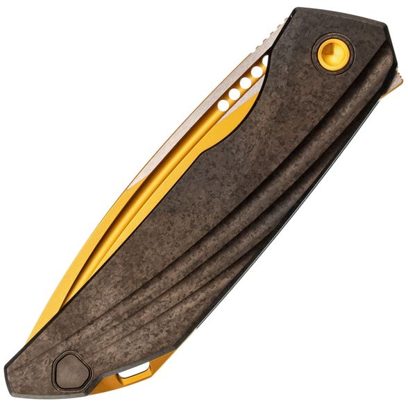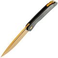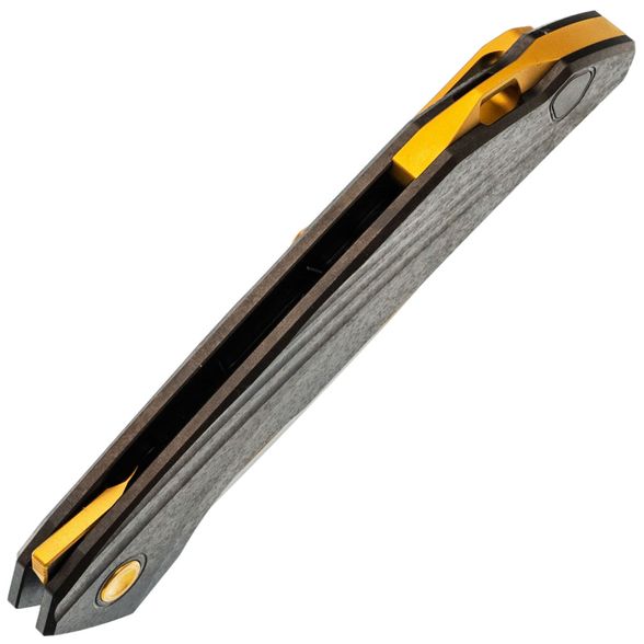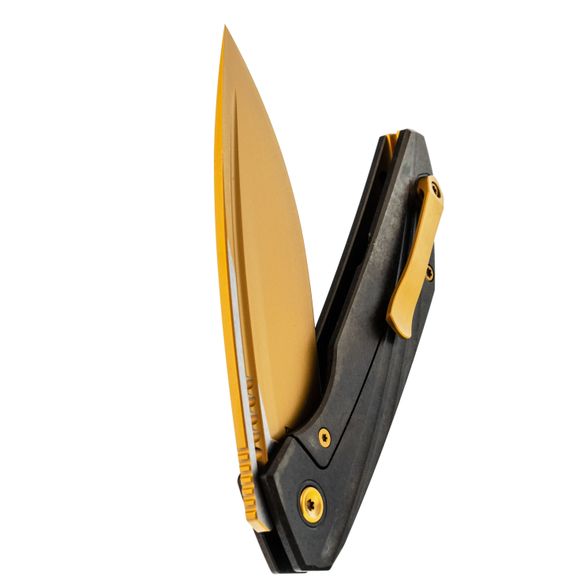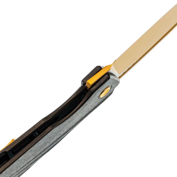 Клинок с профилем Drop-Point - универсальный вариант на каждый день. Высокие прямые спуски и тонкое сведение позволяют аккуратно резать картон, стропы, продукты и уверенно строгать дерево. На поверхность нанесено золотистое PVD-покрытие: оно не только привлекает внимание, но и добавляет стойкости к износу и коррозии. Открытие реализовано через флиппер - он аккуратно вписан в общий силуэт, не ломает плавные линии и при этом дает быстрый и понятный доступ к клинку. Замок Frame-Lock фиксирует клинок жестко и предсказуемо, позволяя без опасений нагружать инструмент в разумных пределах.