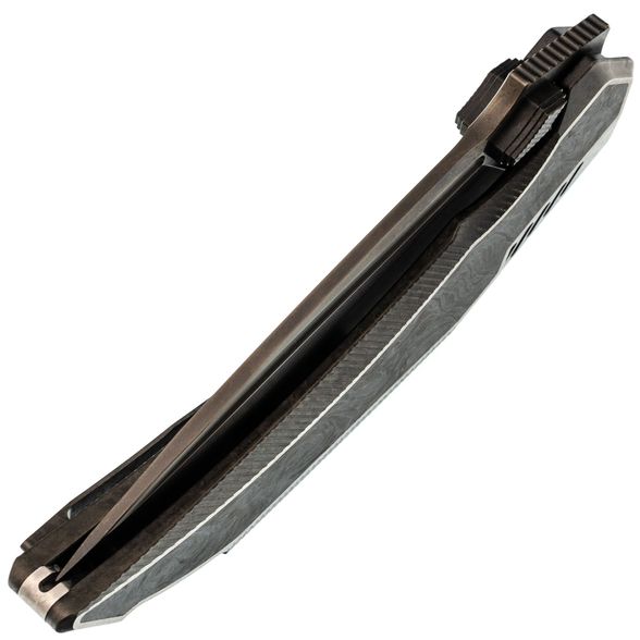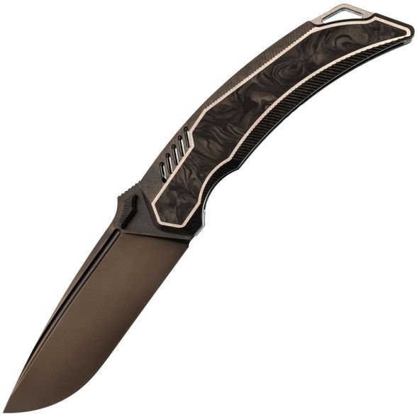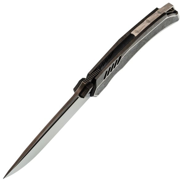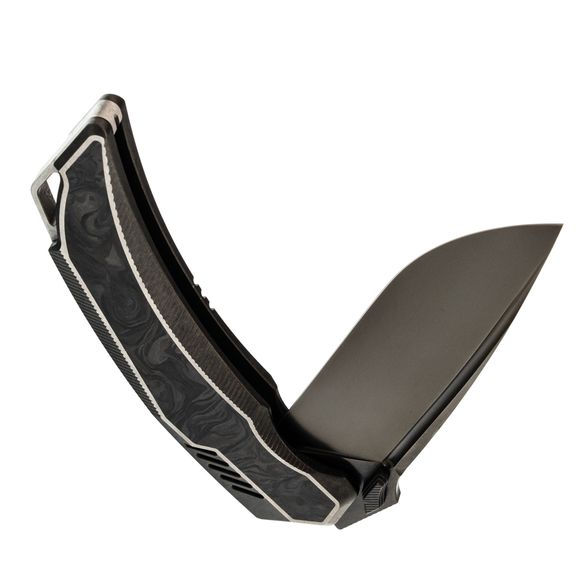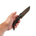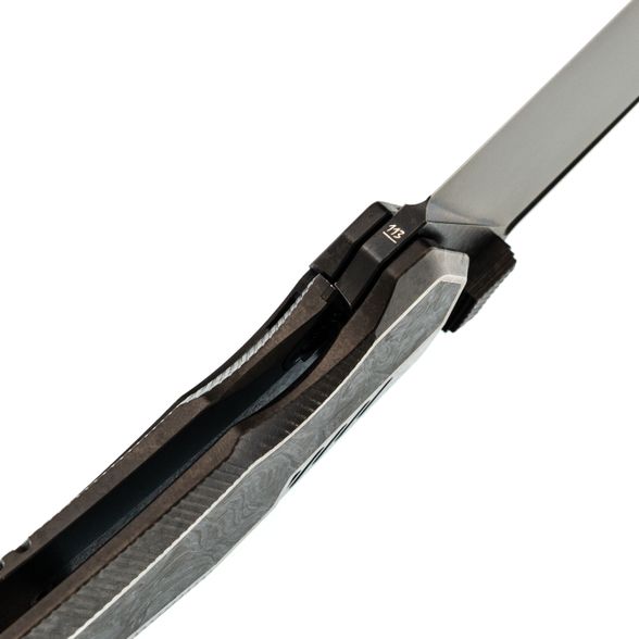 Форма рукояти подобрана так, чтобы крупный нож уверенно сидел и в средней, и в большой ладони. Титан создаёт ощущение надёжного каркаса, а карбоновая вставка добавляет модели немного "формального" стиля - Tiburon одинаково уместен и в джинсах, и под пиджак. Frame-Lock даёт жёсткую фиксацию клинка, титановая клипса отвечает за удобное ношение, а темлячное отверстие оставляет пространство для персонализации ножа под себя.