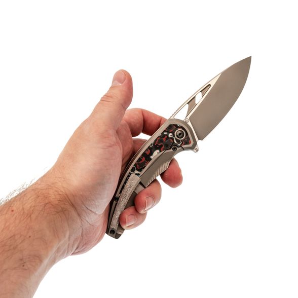 Рукоять эргономична и продумана под естественный хват. Подпальцевая выемка добавляет уверенности в работе. Цельнофрезерованная титановая клипса надёжно фиксирует нож на кармане и не теряет форму со временем. Всё ощущается цельным - будто Whale всегда был частью вашего повседневного набора.