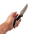 У Xamao универсальный профиль клинка Drop-Point с характерным "гарпунным" выступом на обухе. В этот выступ удобно упереть палец, когда требуется аккуратный контролируемый рез - будь то точная работа по картону, стропе или продуктам в походе. Высокие прямые спуски позволяют клинку легко входить в материал: нож отлично режет, уверенно строгает дерево и не клинит в плотных заготовках. Форма обуха и линия режущей кромки дают хороший баланс между прокольными и протяжёнными резами, а сталь T10S помогает клинку долго оставаться острым даже при регулярной работе. Открытие реализовано через флиппер: лёгкое движение пальцем - и клинок подаётся к работе быстро и без лишних манипуляций.