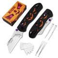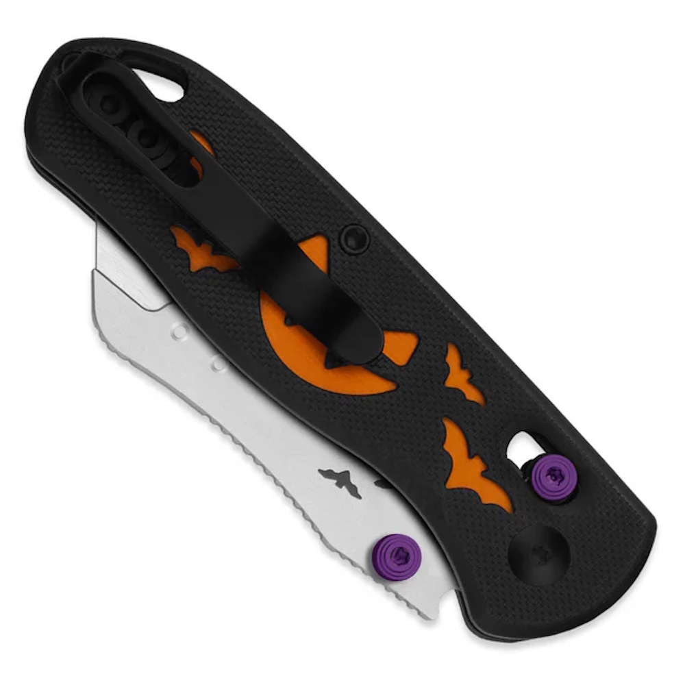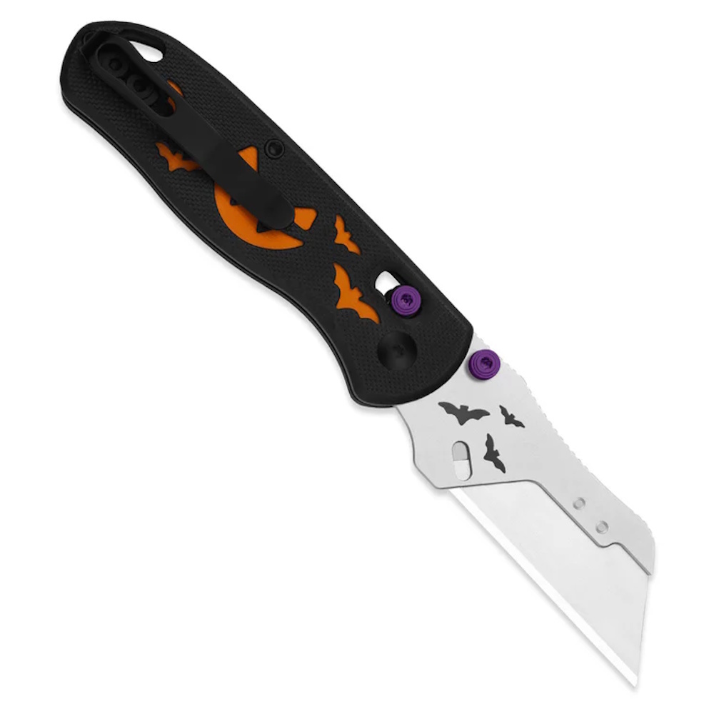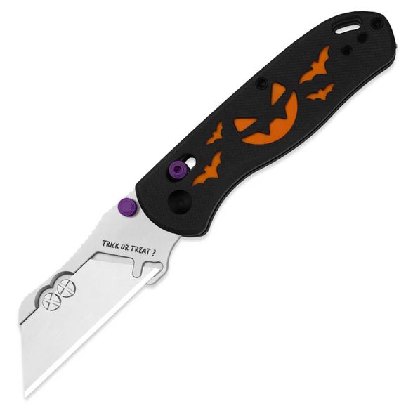 Конструкция со сменными лезвиями делает этот инструмент невероятно удобным для повседневного использования. Вам не потребуется специальное оборудование для заточки - просто установите новое лезвие, когда это необходимо. Надежный замок Clutch Lock обеспечивает безопасную работу, а гравировка с летучими мышами и знаменитой фразой "Trick or treat?" добавляет игривости в дизайн.