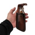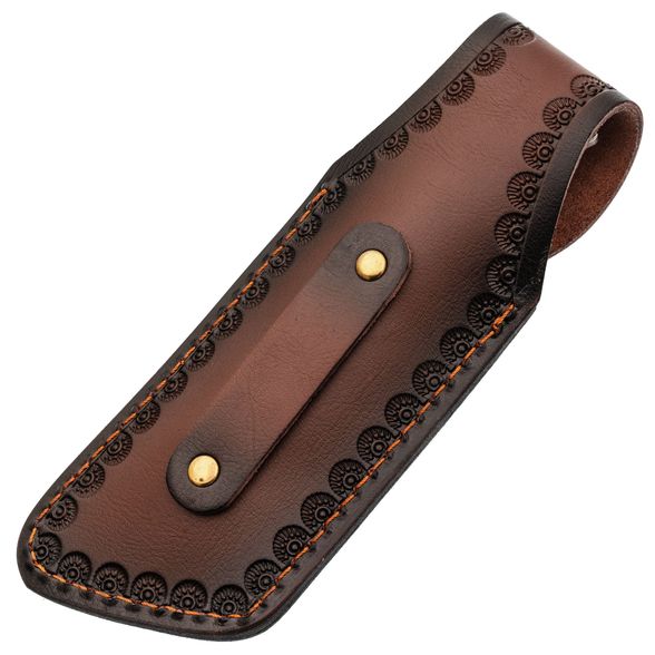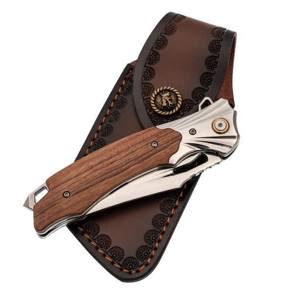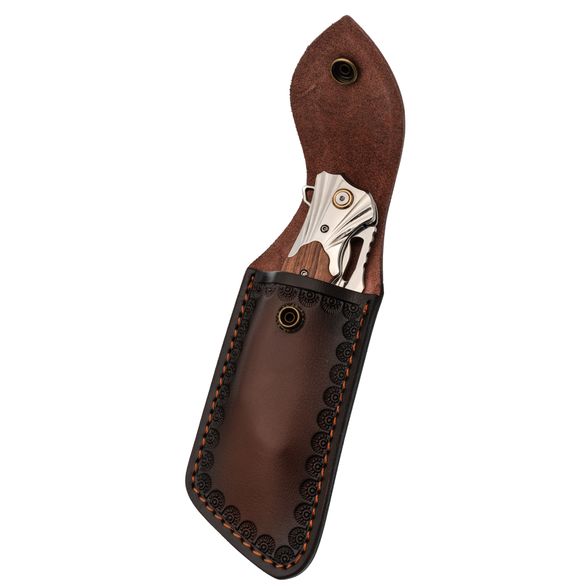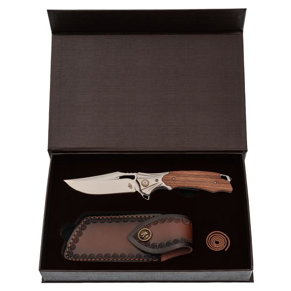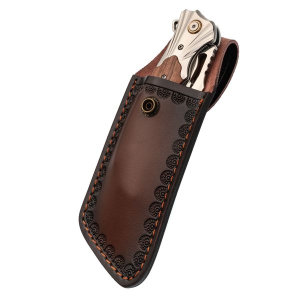 Так как нож не оснащён карманной клипсой, в комплекте идёт кожаный чехол для ношения на ремне. Это практичное дополнение позволяет всегда иметь нож под рукой, не беспокоясь о его сохранности. Качество кожи и удобный дизайн делают чехол надёжным и долговечным аксессуаром для повседневного использования.