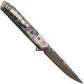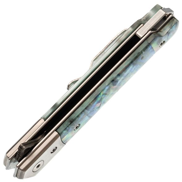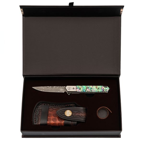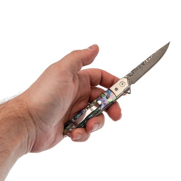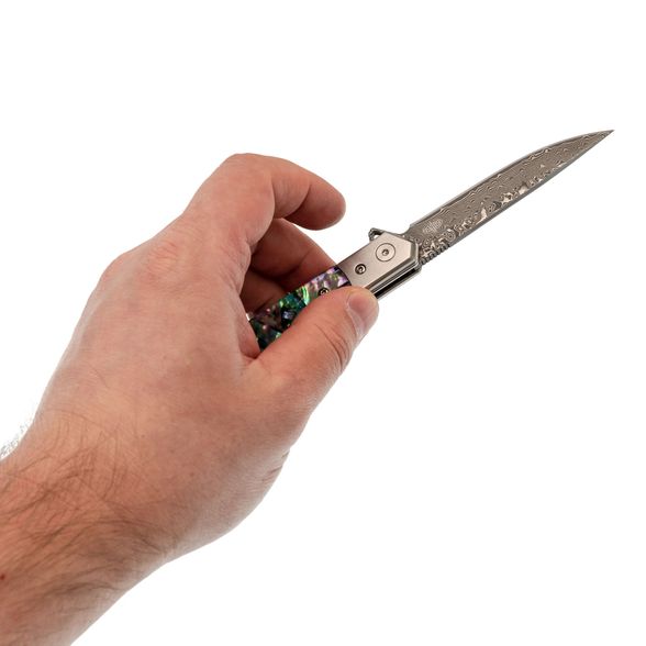 - Стильная рукоять из металла и оргстекла с перламутром не только надёжна, но и придаёт ножу эффектный внешний вид.