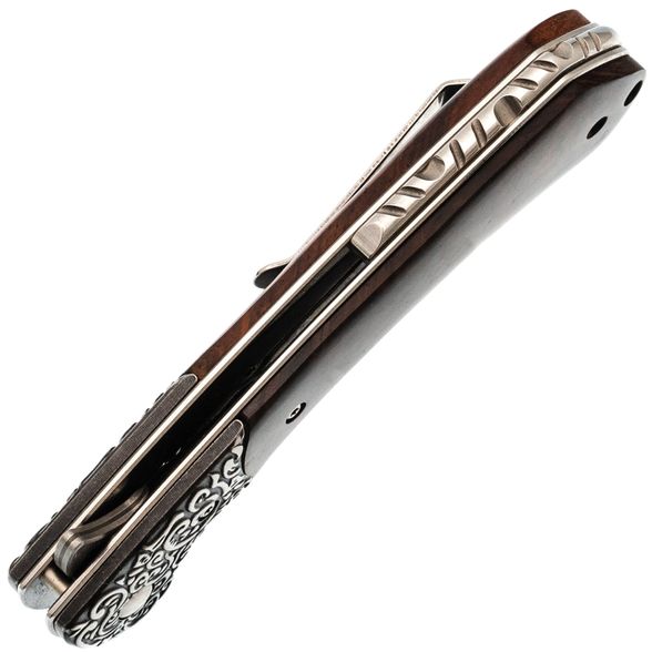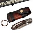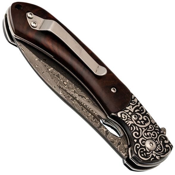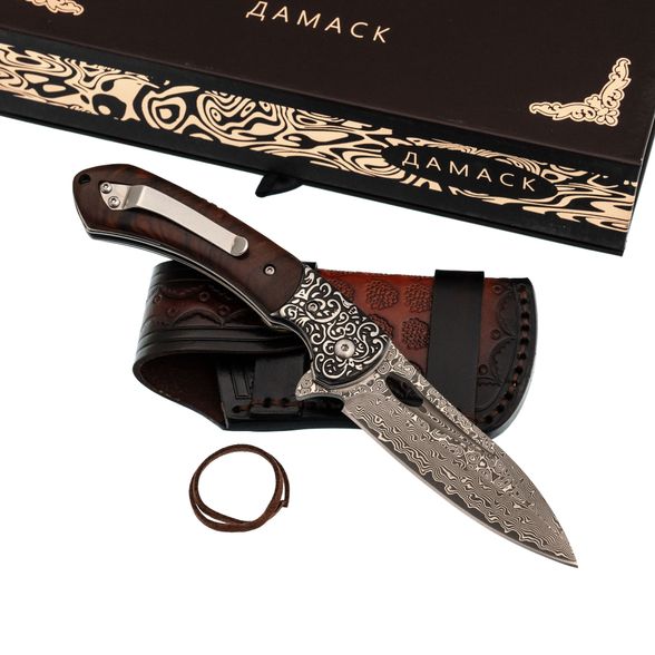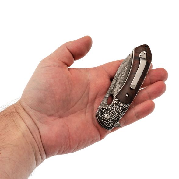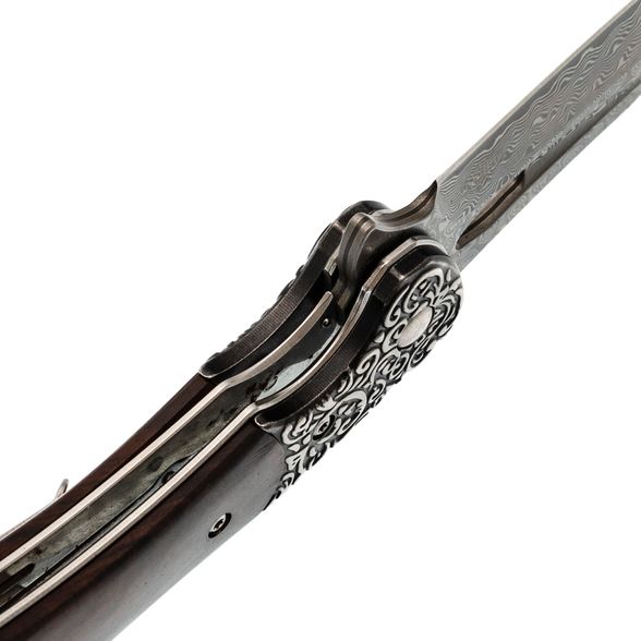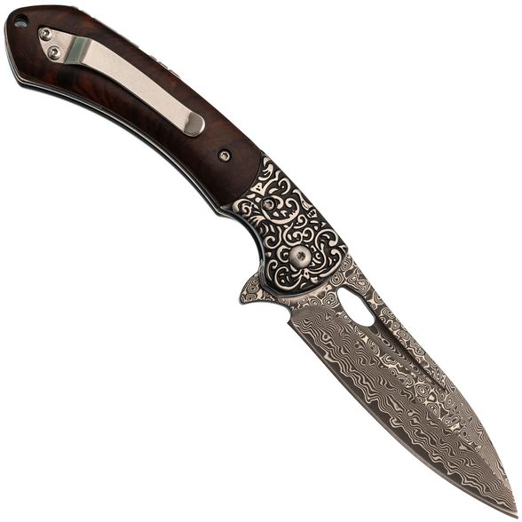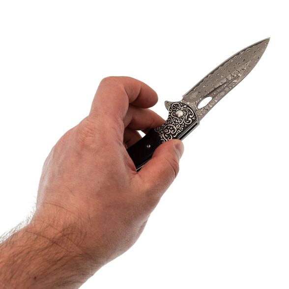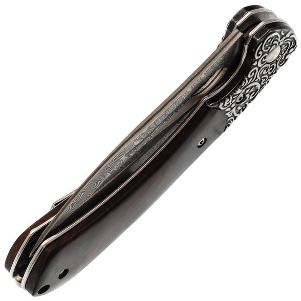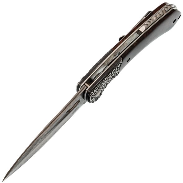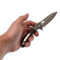 Клинок выполнен из дамасской стали с выразительным травлением - не только прочный и износостойкий, но и эффектный внешне. Геометрия клинка проста, но чрезвычайно резучая - он легко справляется с большинством бытовых и туристических задач. Надёжный механизм фиксации типа Liner-Lock обеспечивает безопасную работу с ножом.
