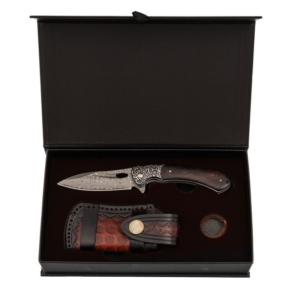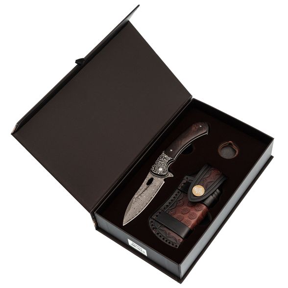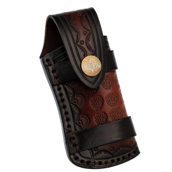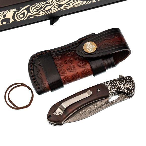 Поставляется нож в комплекте с качественным кожаным чехлом. Чехол снабжён универсальной системой крепления и может быть размещён на ремне как вертикально, так и горизонтально - это удобно, надёжно и позволяет выбрать оптимальный способ ношения в зависимости от ситуации. Также в комплект входит подарочная коробка и кожаный темляк, завершающий образ премиального аксессуара.
