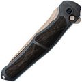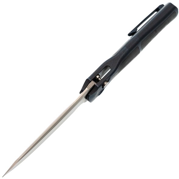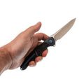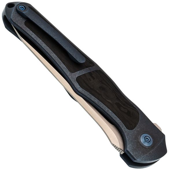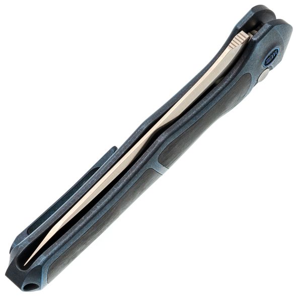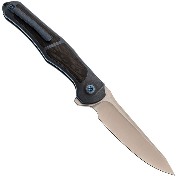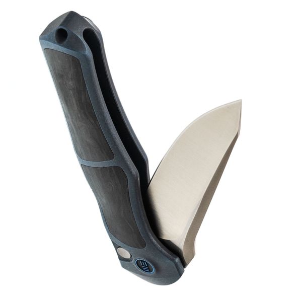 Рукоять выполнена из цельного куска титана по интегральной технологии, что исключает ослабляющие конструкцию швы и повышает общую надёжность. Вставки из карбона не только декоративны, но и уменьшают общий вес. Эргономика соответствует стандарту WE Knife - чёткий хват и сбалансированная геометрия.