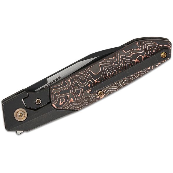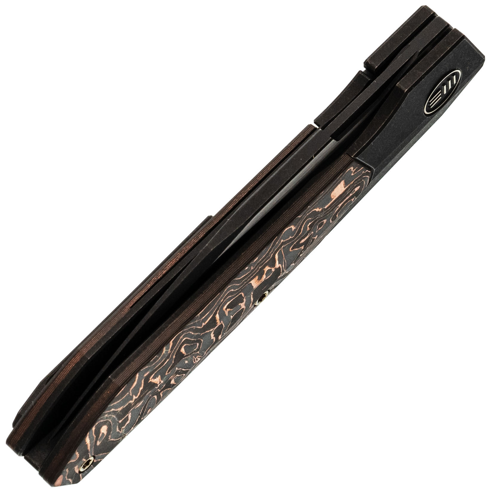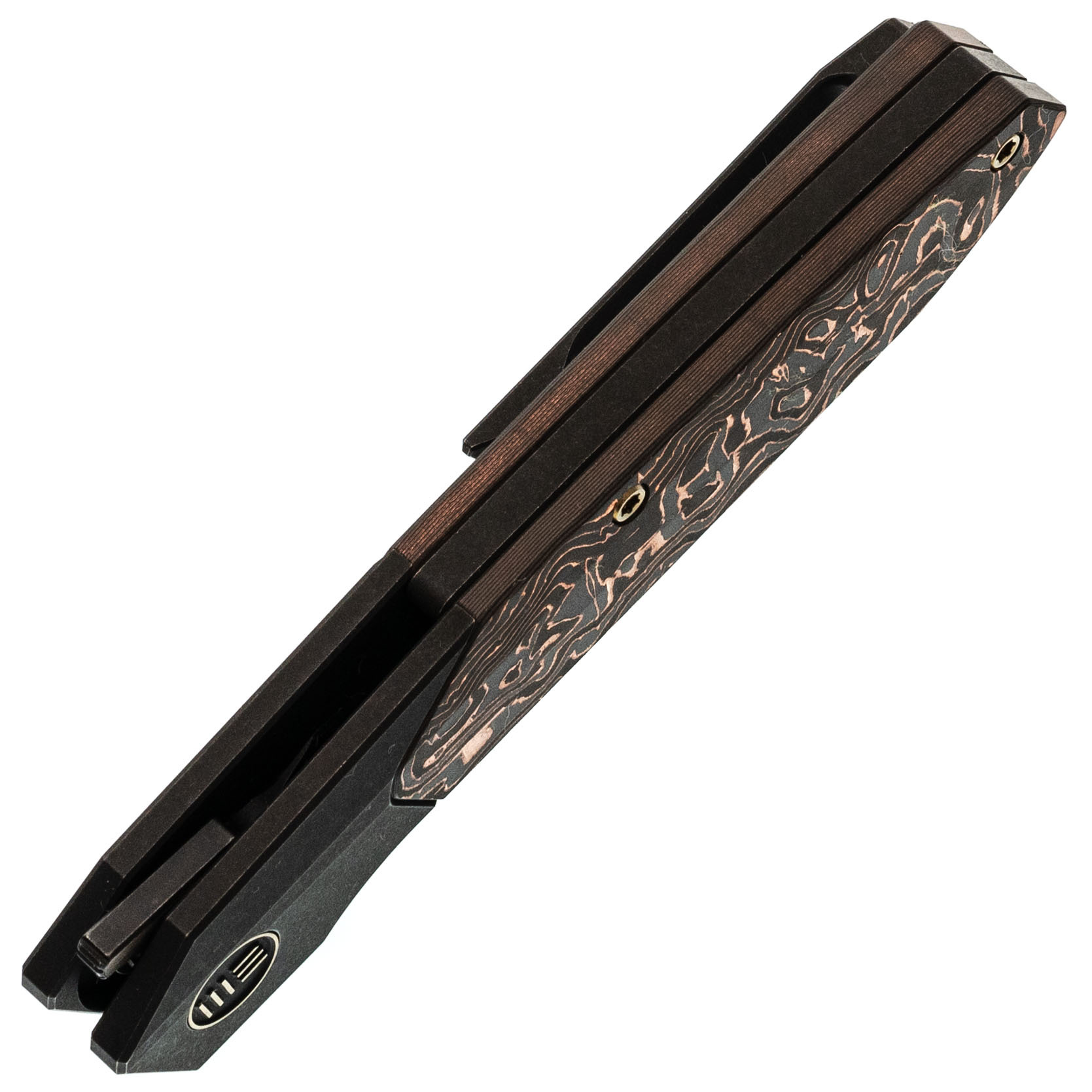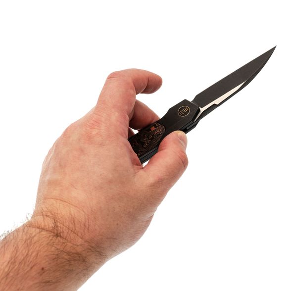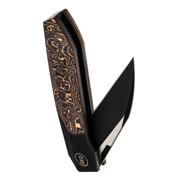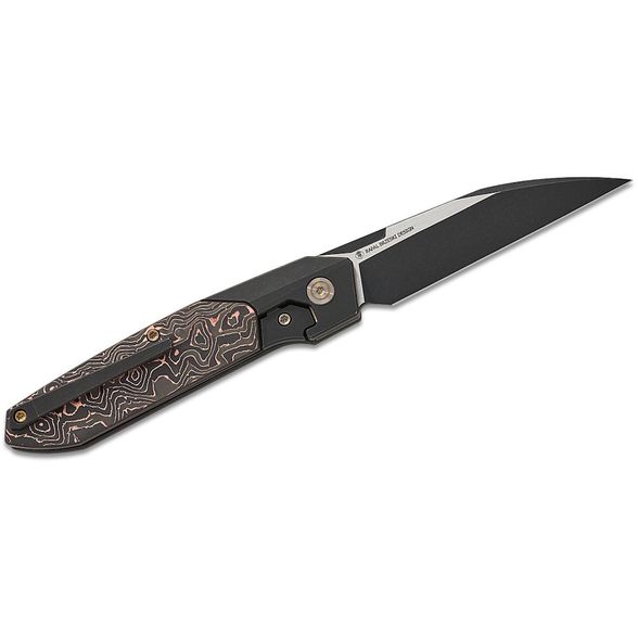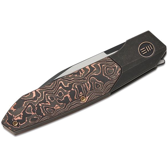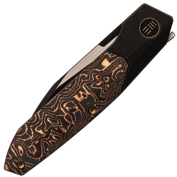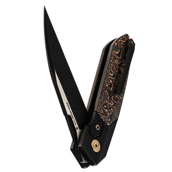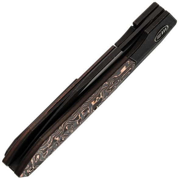 Рукоять из титанового сплава 6AL4V - сочетает малый вес, исключительную прочность и устойчивость к повреждениям. Вставка из карбона с медной фольгой добавляет индивидуальности и подчеркивает современный стиль ножа.