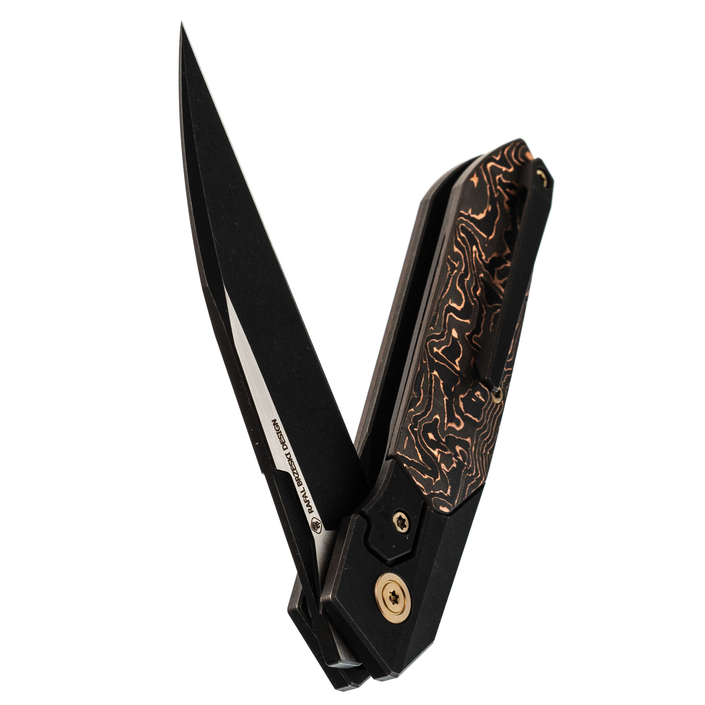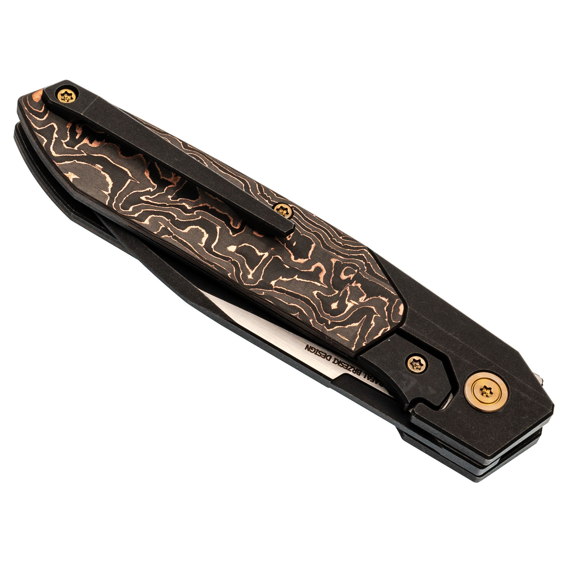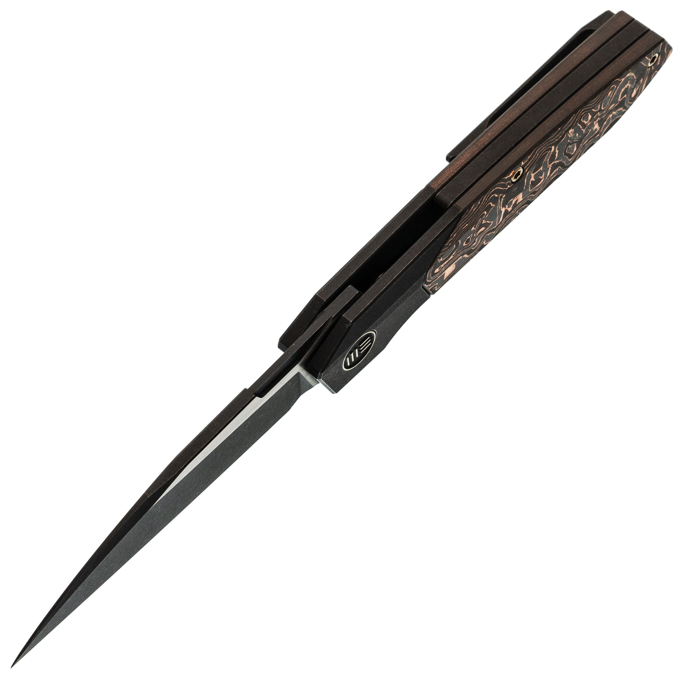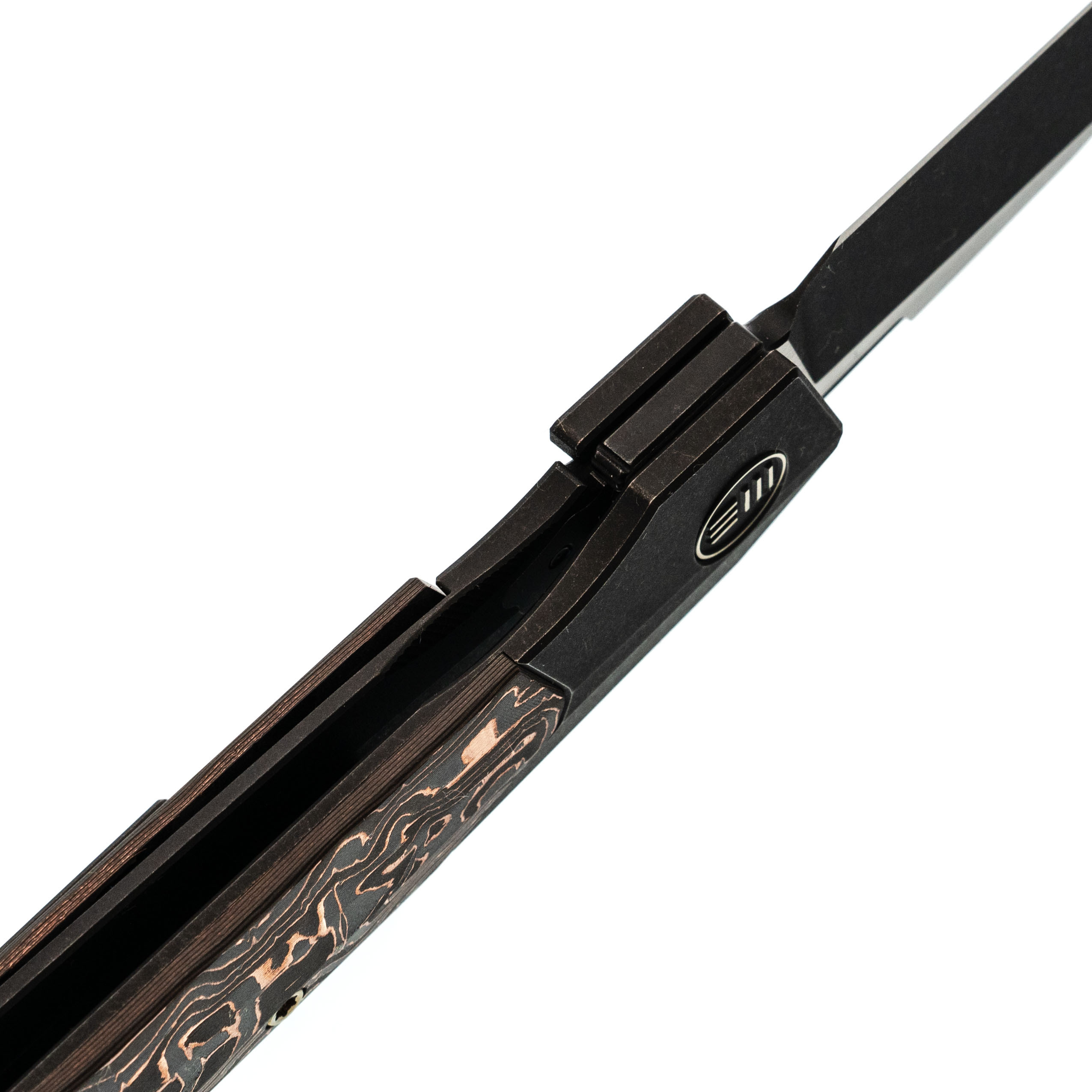 Рукоять из титанового сплава 6AL4V - сочетает малый вес, исключительную прочность и устойчивость к повреждениям. Вставка из карбона с медной фольгой добавляет индивидуальности и подчеркивает современный стиль ножа.