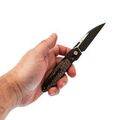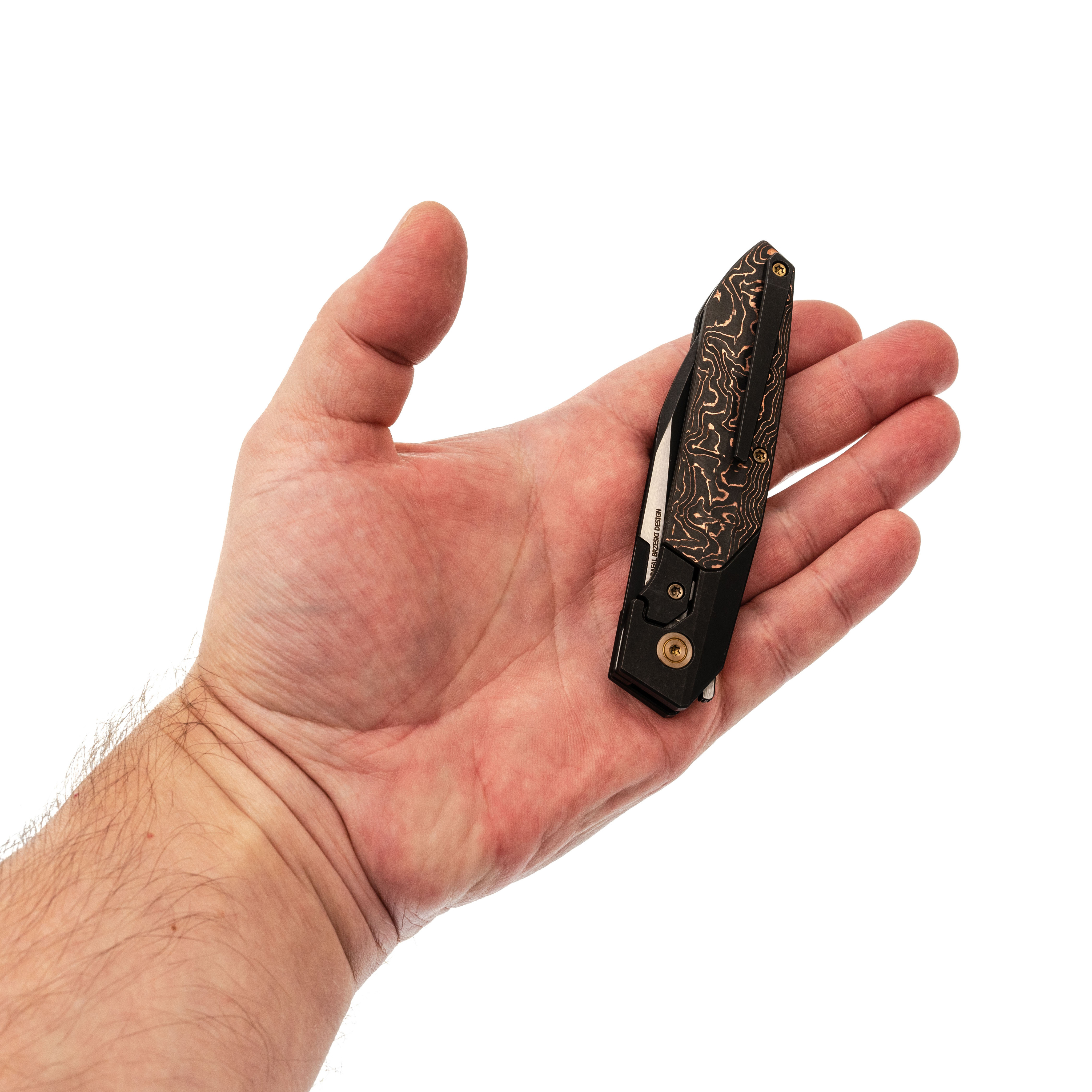 Рукоять Brr15 - это гармония современных технологий и практичной формы. Титановый корпус с инкрустацией из медного карбона не только стильно выглядит, но и обеспечивает комфортный хват даже при длительной работе. Футуристичная геометрия с множеством граней удивительно хорошо ложится в ладонь, а компактные размеры делают нож отличным вариантом для повседневного ношения. Надежный замок Frame Lock гарантирует безопасность эксплуатации, а клипса обеспечивает уверенную посадку в кармане без риска утери.