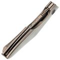 Эргономичная рукоять с крупной подпальцевой выемкой и мягкими скруглениями естественно ложится в ладонь, не давит и не скользит. На спинке - декоративная вставка из тимаскуса, которая создаёт аккуратный акцент. За фиксацию отвечает Liner-Lock: ход плавный, закрытие интуитивное. Клипса компактная, не мешает хвату.