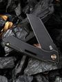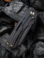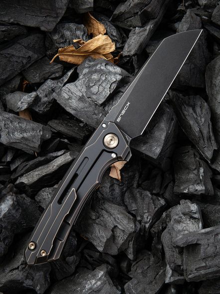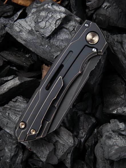 СКЛАДНОЙ НОЖ WE KNIFE MINI BUSTER ANTIQUE BRONZE, CPM 20CV это модель для настоящих ценителей ножевого искусства. Не читайте это описание и не рассматривайте фотографии - гарантируем, вы не сможете остановиться, вам обязательно захочется приобрести этот нож. Первое - совершенно ни на что не похожий передовой дизайн. Вы только посмотрите на форму рукояти, сквозь черный цвет которой проступают проблески античной бронзы. Форма клинка отсылает к классическому шипфуту, но выполнена в более агрессивной манере. Высокие спуски образуют бритвенно острую режущую кромку. Плюс, достаточная ширина обуха обеспечивает высокий запас надежности.