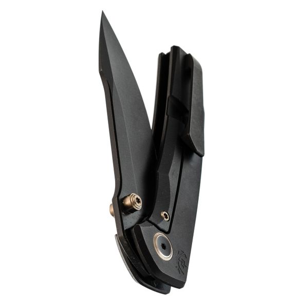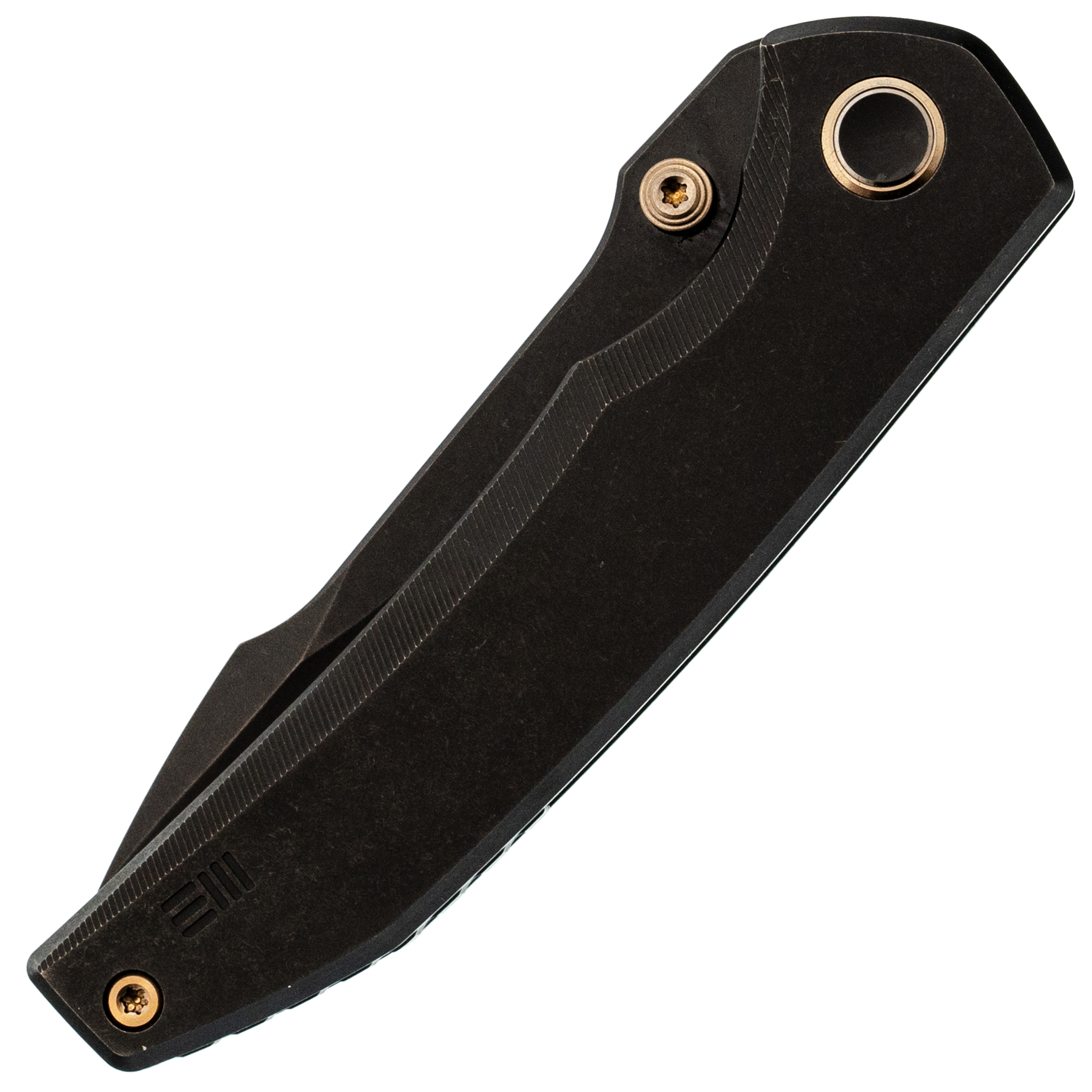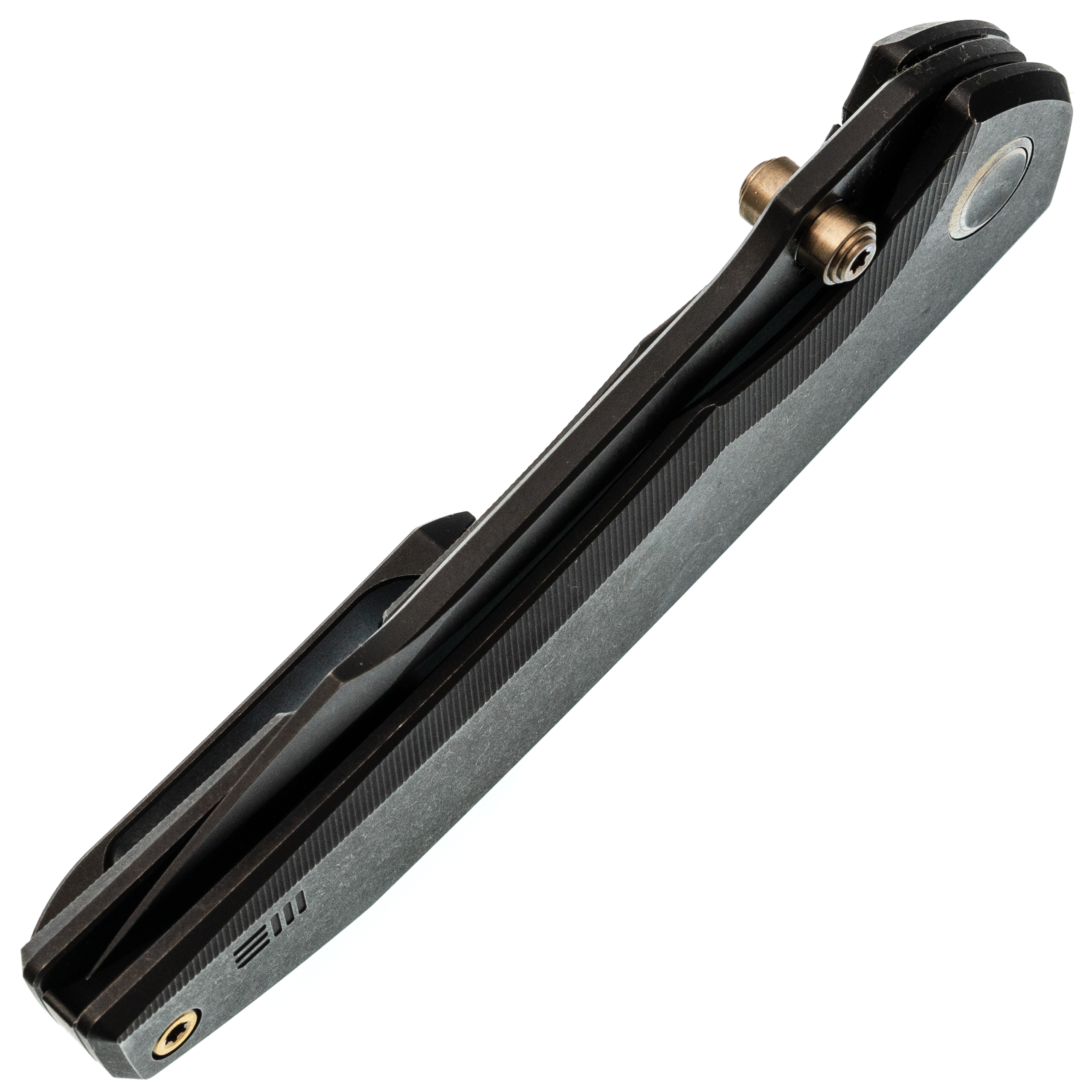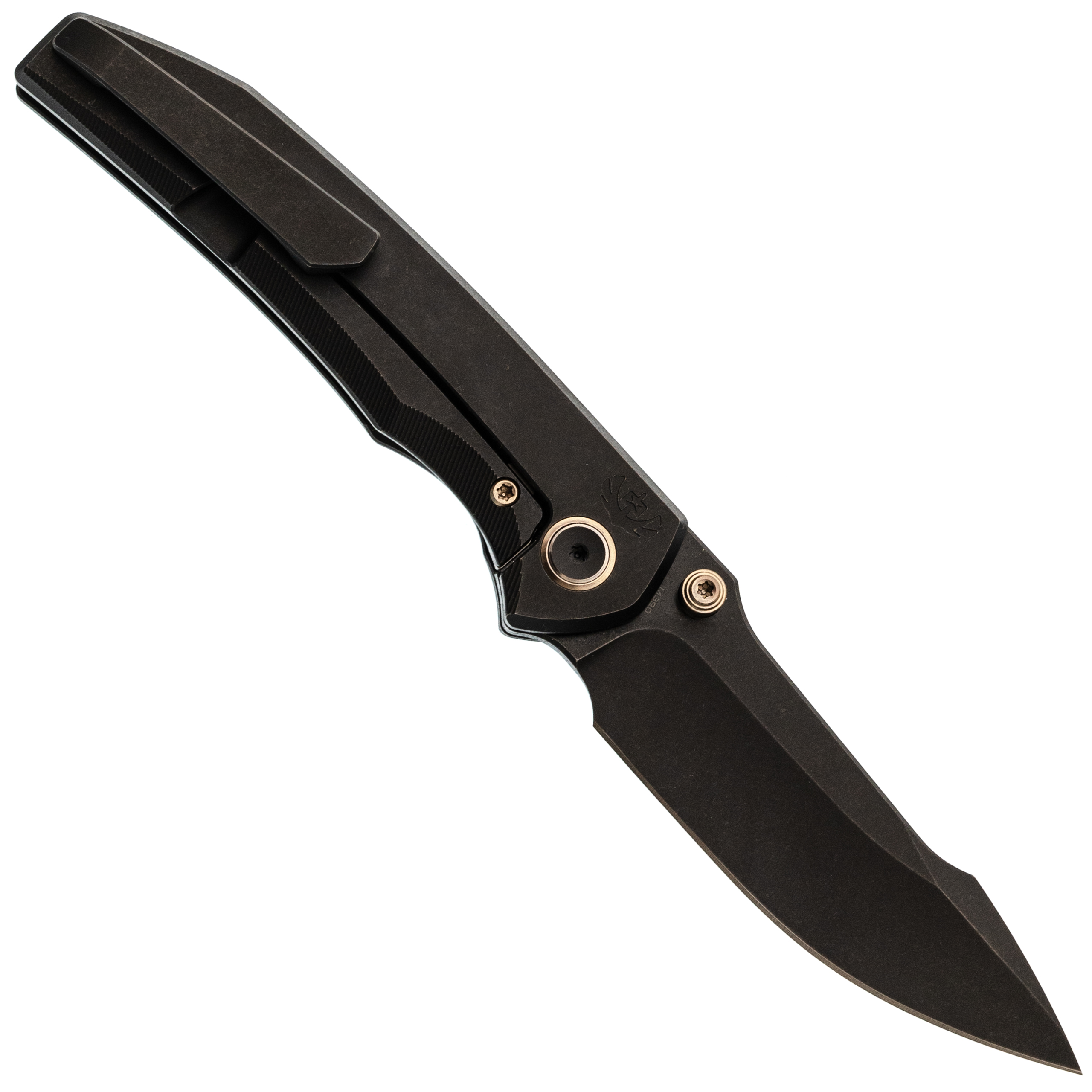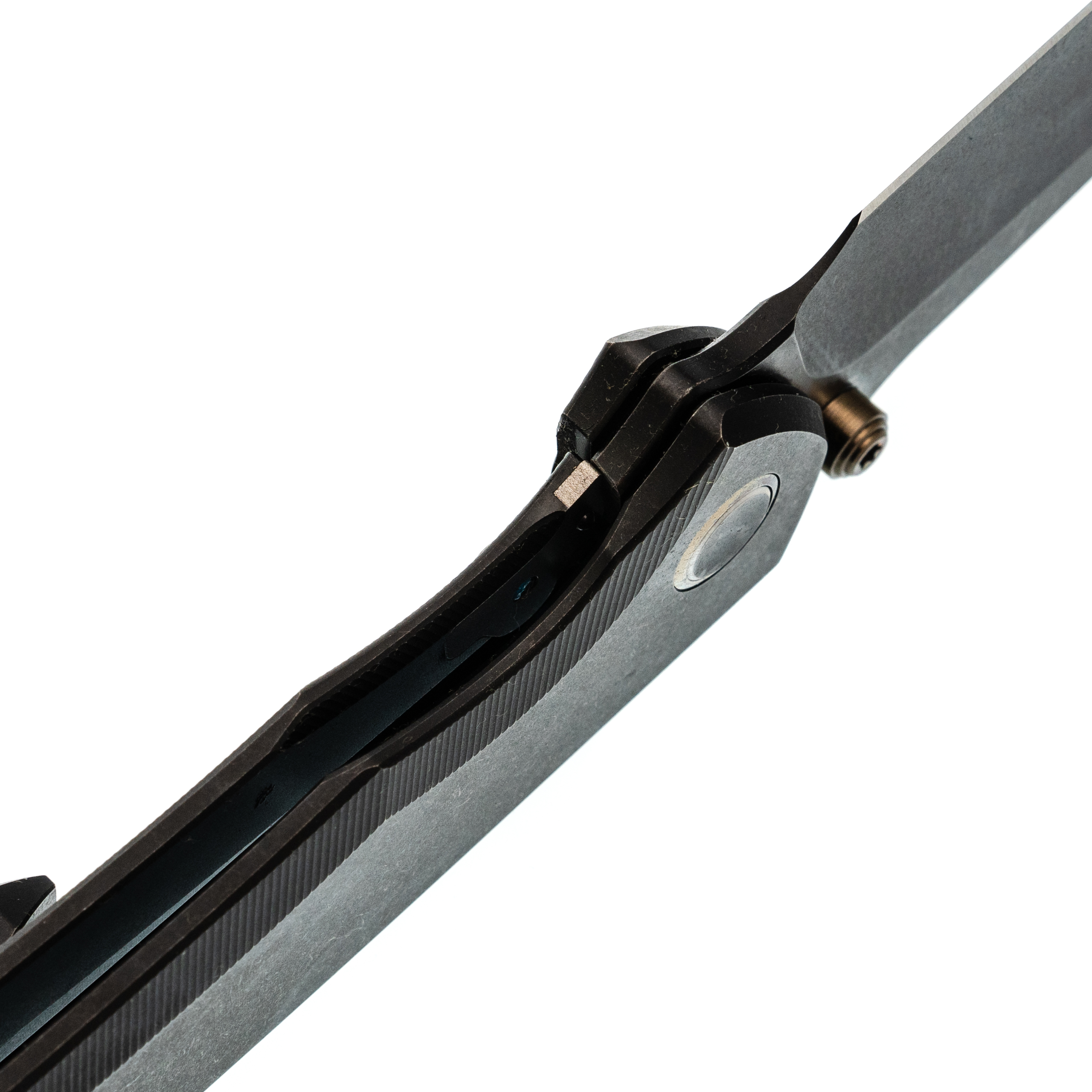 Рукоять этого ножа выполнена из прочного титана, что делает ее легкой и в то же время чрезвычайно устойчивой к внешним воздействиям. Текстурированная поверхность обеспечивает надежный захват, а минималистичный, но элегантный дизайн делает нож удобным в руке и придает ему современный вид. В сочетании с бронзовыми шайбами, рукоять выглядит стильно и отличается высокой функциональностью.