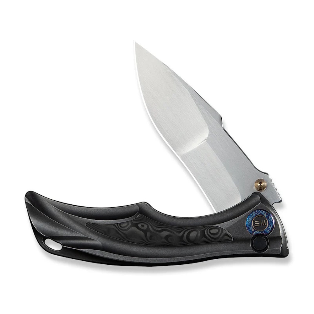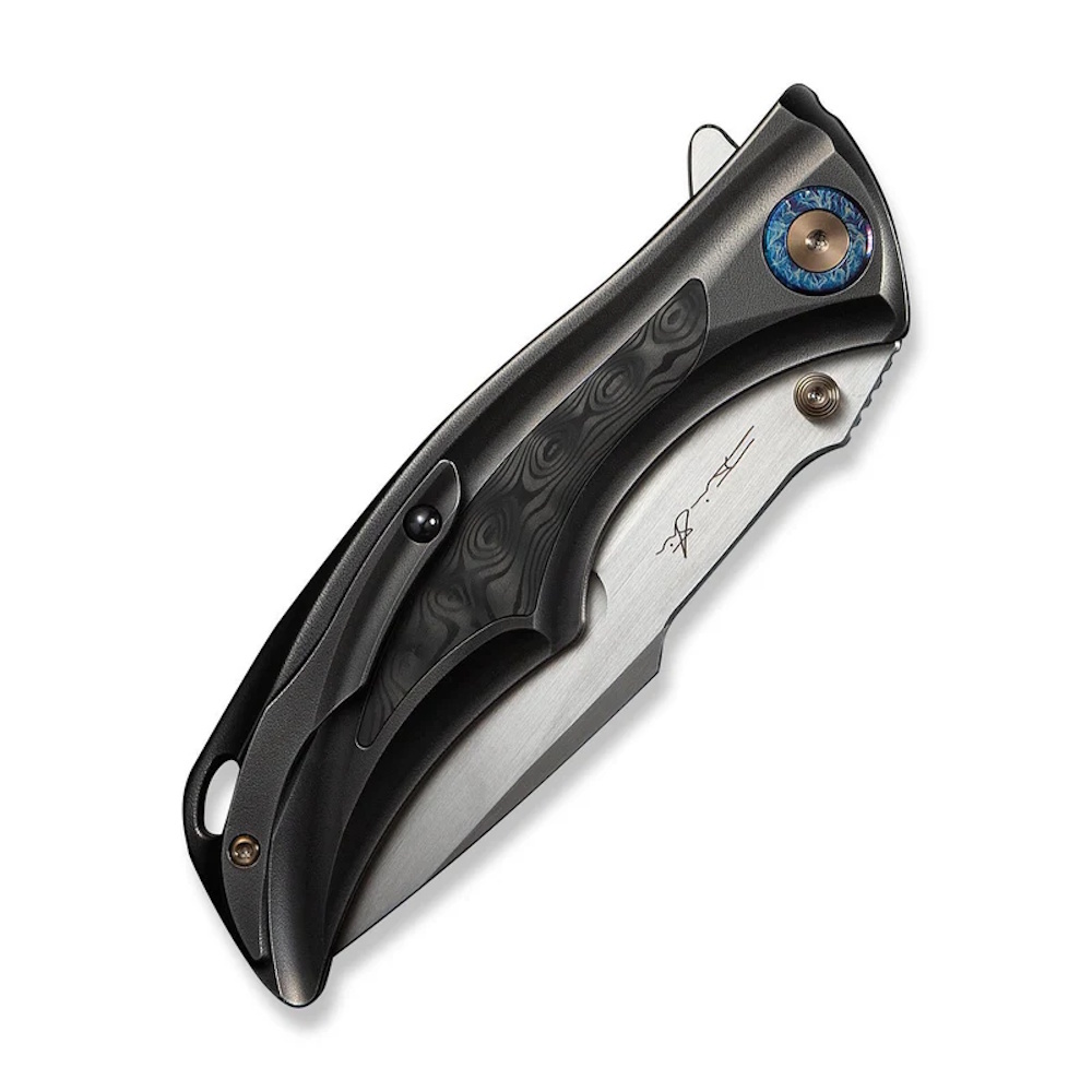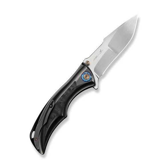 Рукоять ножа выполнена из текстурированного титана, что придает ей отличный захват, а вставки из карбона добавляют уникальный визуальный акцент. Титановая рукоять прочна, легка и устойчива к механическим повреждениям, а карбон не только улучшает внешний вид ножа, но и добавляет дополнительную прочность. Все эти материалы делают нож не только стильным, но и удобным в использовании, обеспечивая комфортный хват в любых ситуациях.