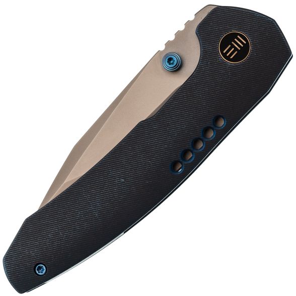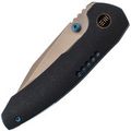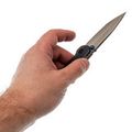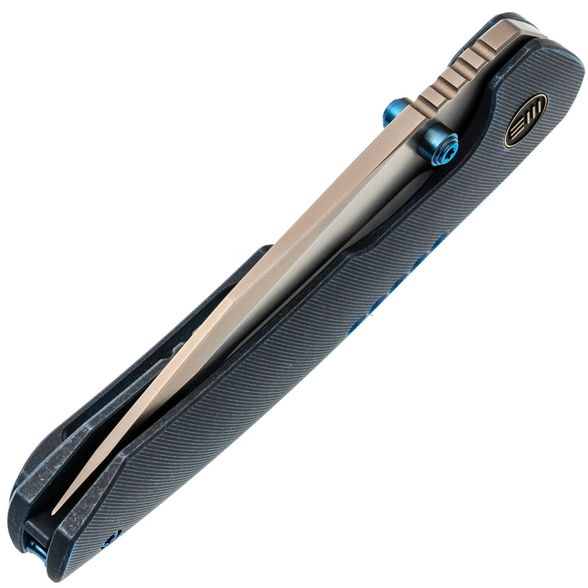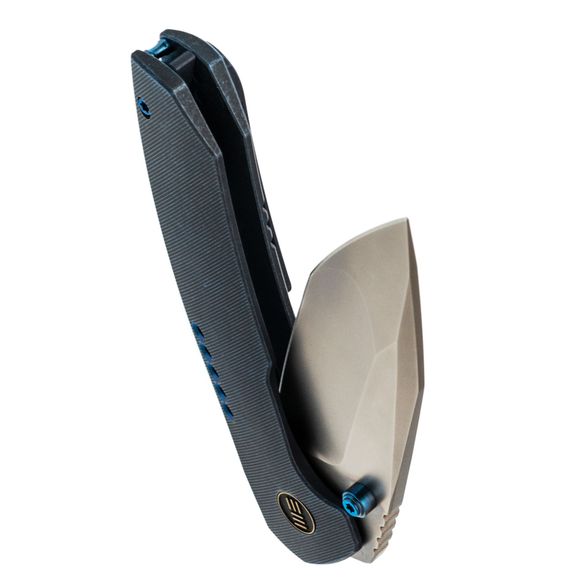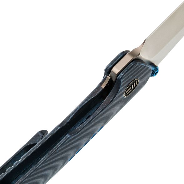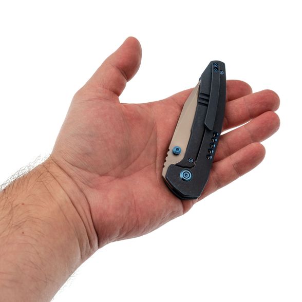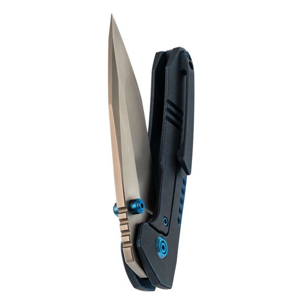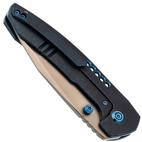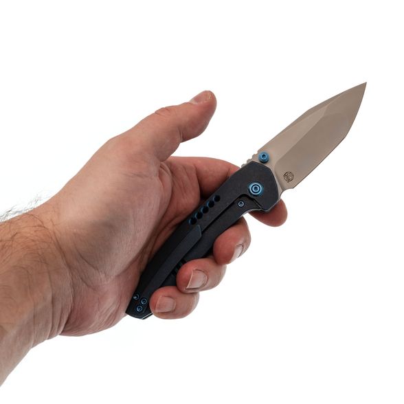 Рукоять выполнена из анодированного титана что даёт ножу прочность и стабильность, при этом не обладая запредельным весом. Форма у рукояти изогнутая и имеет ярко выраженную подпальцевую выемку - это позволит ножу и удобно лежать в руке, и защитит руку от соскальзывания на режущую кромку.
