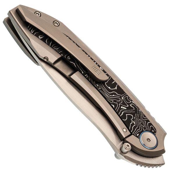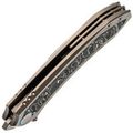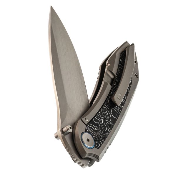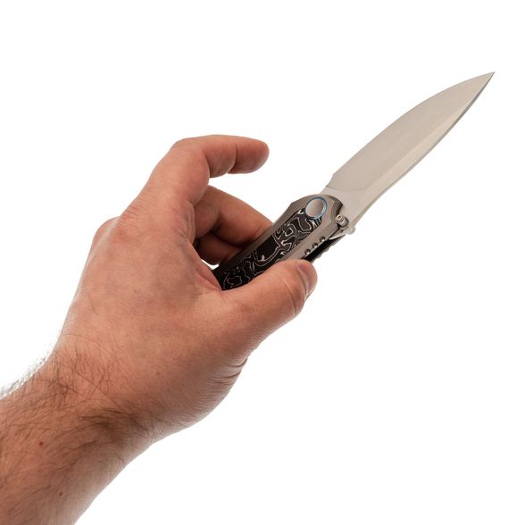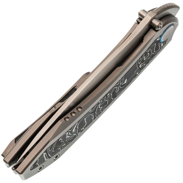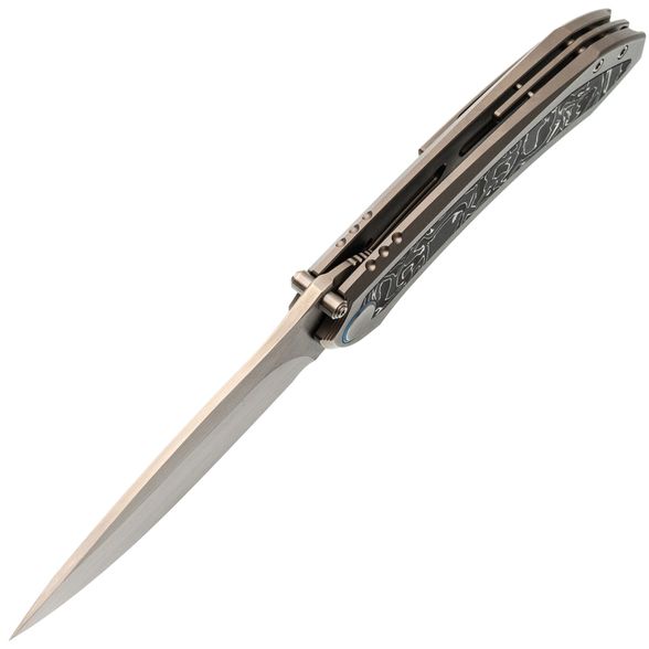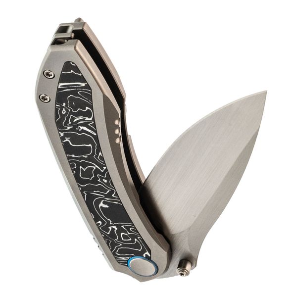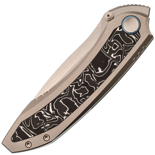 Форма рукояти проста, удобна и не перегружена лишними элементами. Основа изготовлена из титана, обладающего высокой прочностью и малым весом, а декоративные вставки из карбона создают яркий визуальный акцент. Чёрно-серый карбон с алюминиевой стружкой выглядит загадочно и глубоко, оставаясь при этом сдержанным — идеальный выбор для тех, кто ценит стиль без лишнего блеска. На спинке расположен тонкий титановый бекспейсер с выемками, придающими конструкции элегантную законченность.