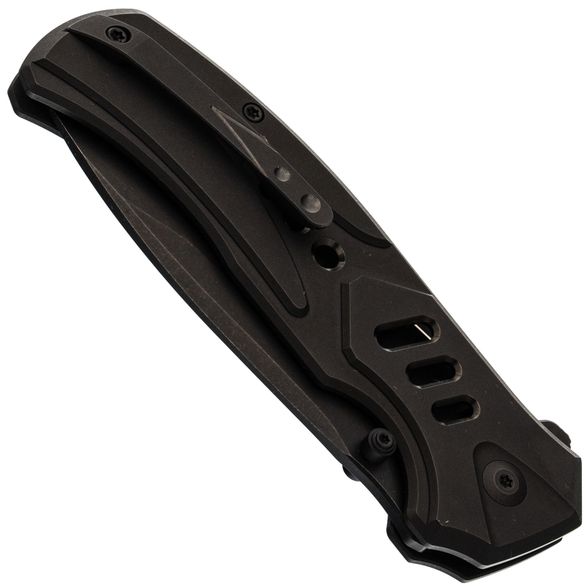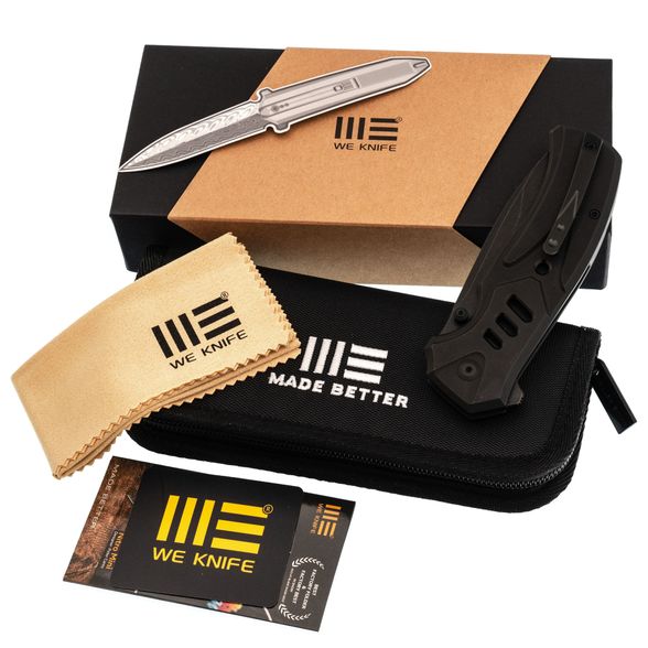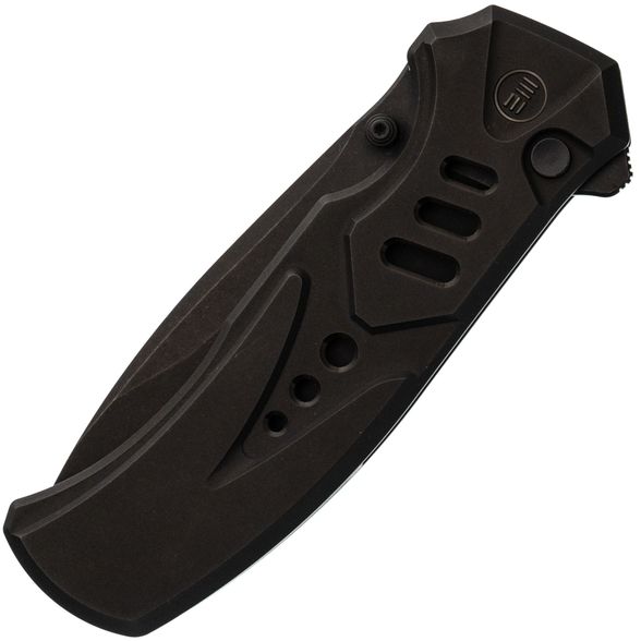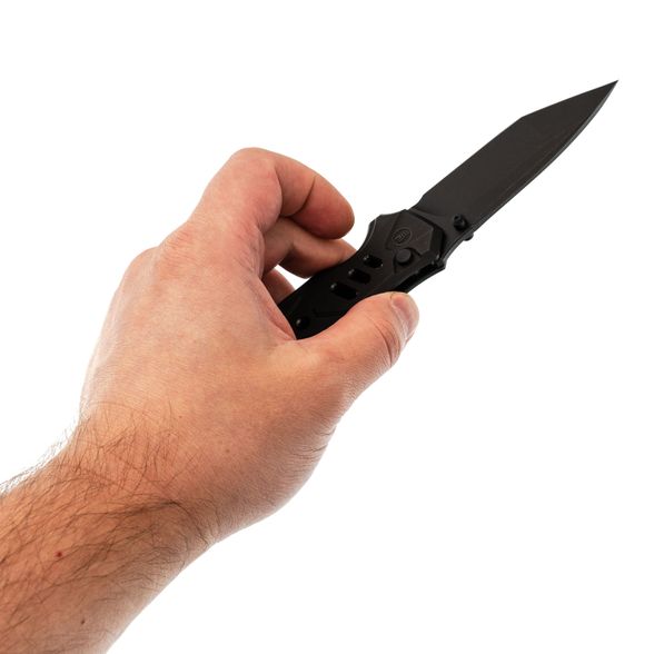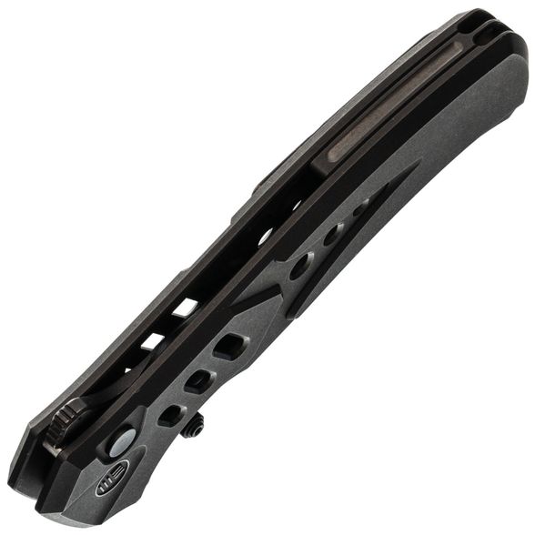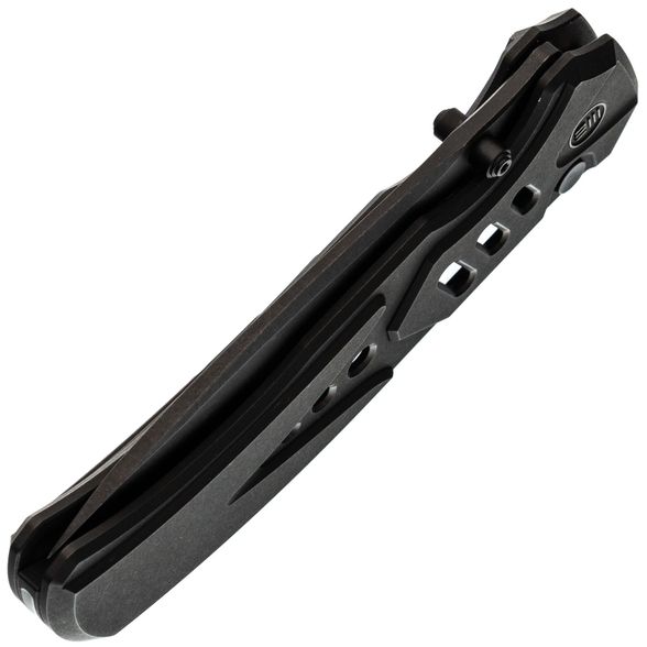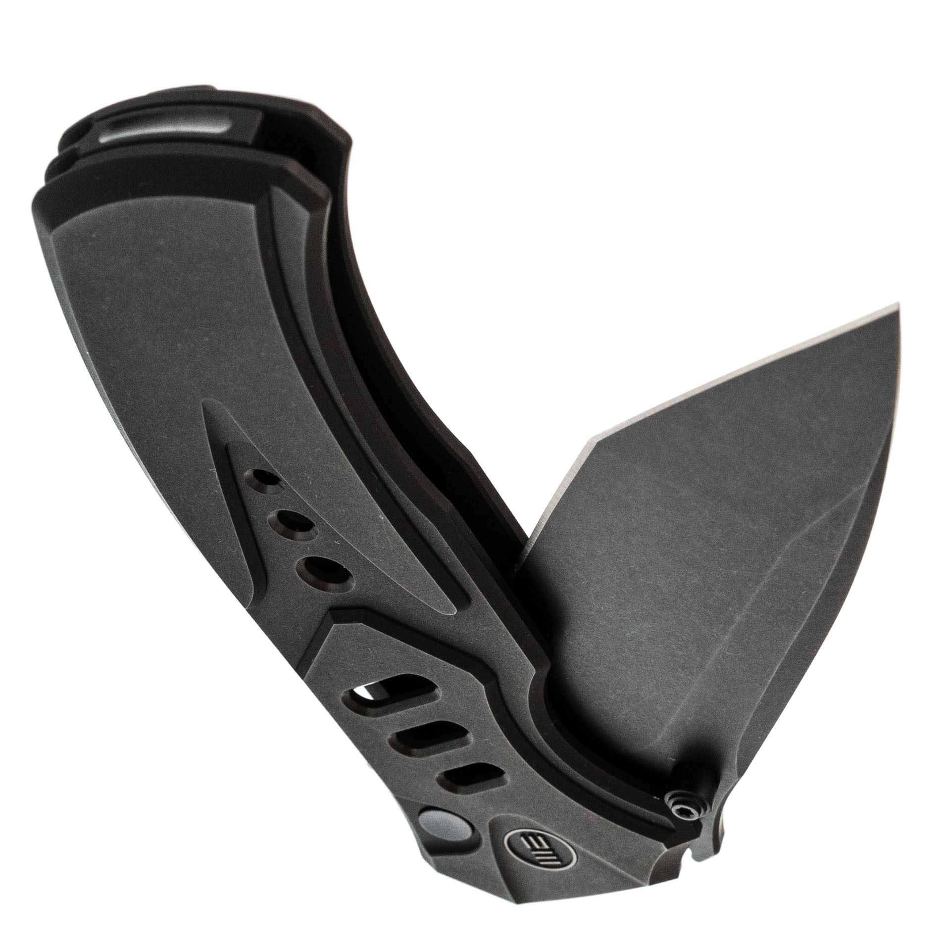 WE Knife Zentron - спокойный, городской складной нож без лишних элементов. Внешность напоминает гаджет из будущего, но с рабочим характером: строгий чёрный титан на рукояти и клинок с Black Stonewash выглядят сдержанно и практично.