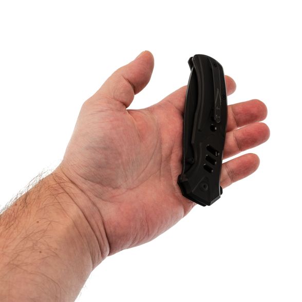 Корпус с заметным изгибом и глубокой подпальцевой выемкой фиксирует кисть в удобном положении. Фрезеровка с отверстиями и перепадами добавляет сцепления и визуальной глубины. Открывать можно как угодно: флиппером, за двусторонние шпеньки или инерционно при нажатой кнопке. Button-Lock делает закрытие простым и безопасным для пальцев.
