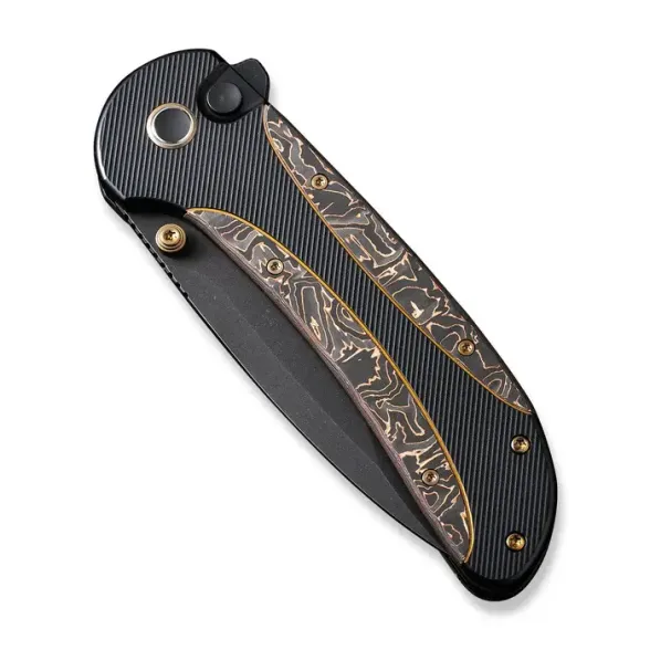 Рукоять имеет эргономичную, удобную для хвата форму. Она изготовлена из анодированного титана - материала, известного своей высокой прочностью и легкостью. Накладки из карбона с медной стружкой придают рукояти изысканный вид. Карбон также считается премиальным материалом в ножевой индустрии благодаря своим превосходным весовым характеристикам и прочности. Сочетание титана и карбона в рукояти Zizit подчеркивает его статус и уникальный дизайн.