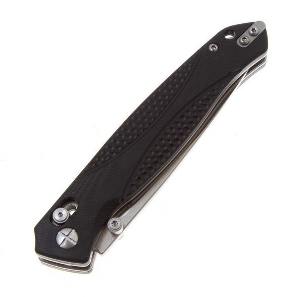 Рукоять ножа имеет эргономичную форму и состоит из накладок стеклотекстолита G10 - всегопогодного материала с высокими показателями прочности и малым весом. Текстура накладок обеспечивает комфортный хват. Из интересных особенностей - наличие темлячного отверстия и осевой узел под плоский шлиц, так что в случае чего его можно подкрутить хоть монеткой.