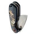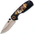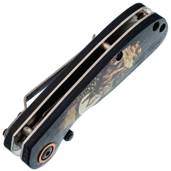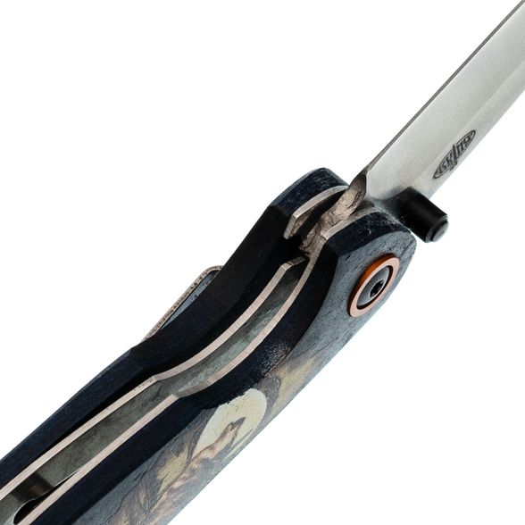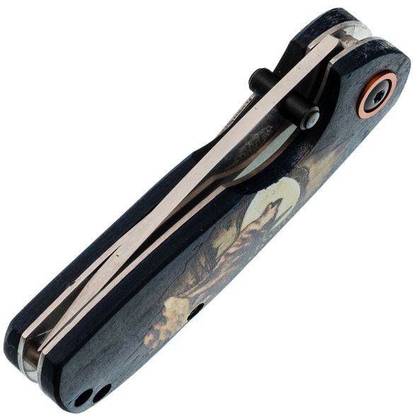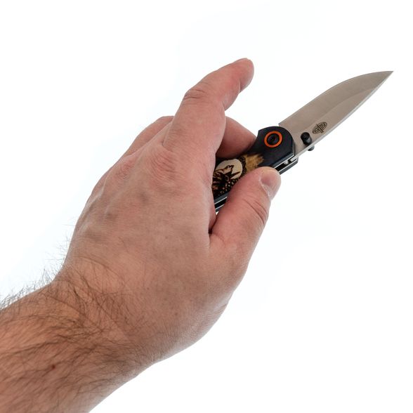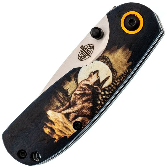 Изюминкой модели является оригинальная рукоять из ламинированной древесины, на которой изображен волк, поднявший голову к небу и воющий на луну. Этот символический образ может означать силу и свободу духа, напоминая о том, что каждый человек, как и гордый волк, способен достигать своих целей и покорять новые вершины. Рукоять удобно лежит в руке, обеспечивая превосходную эргономику.