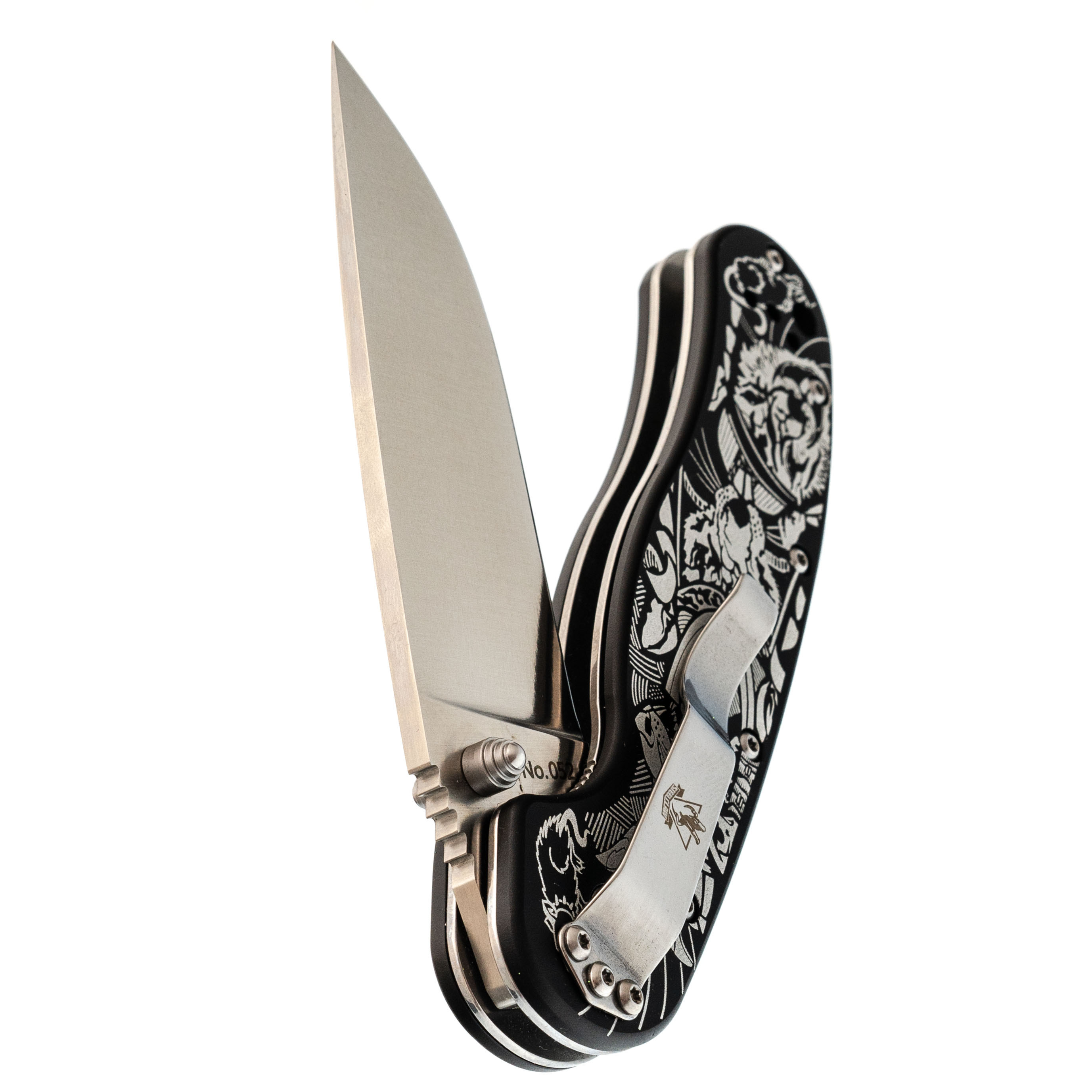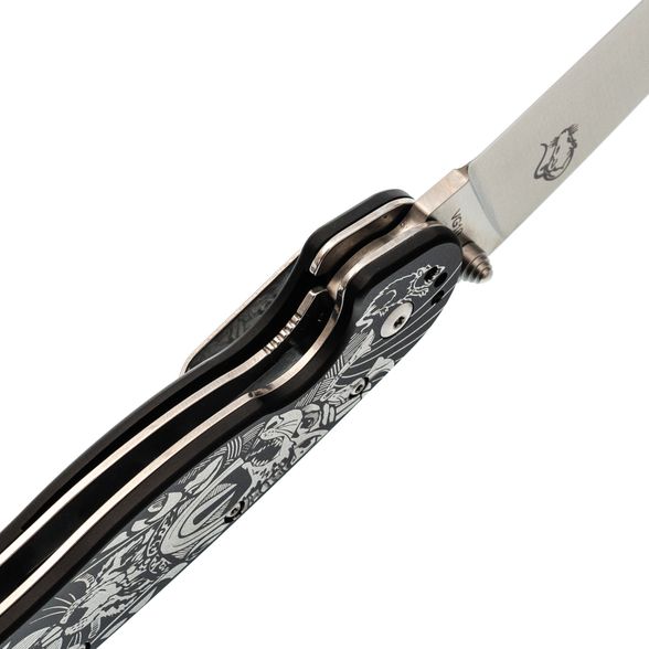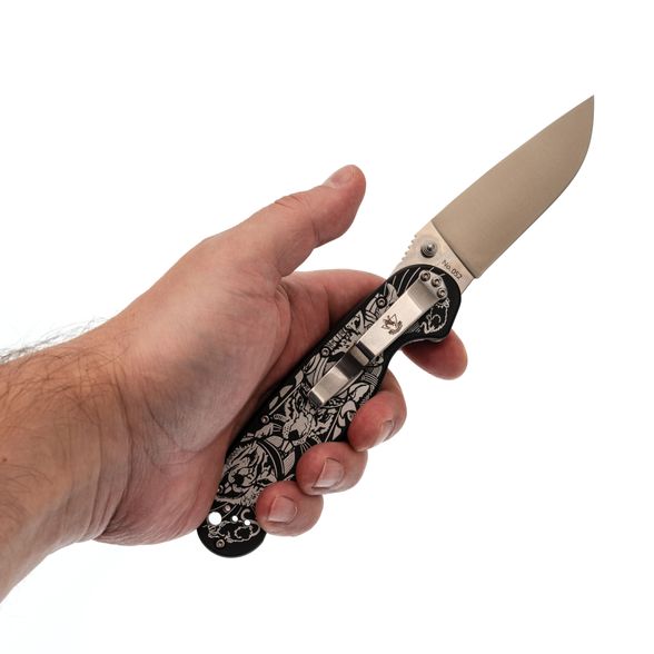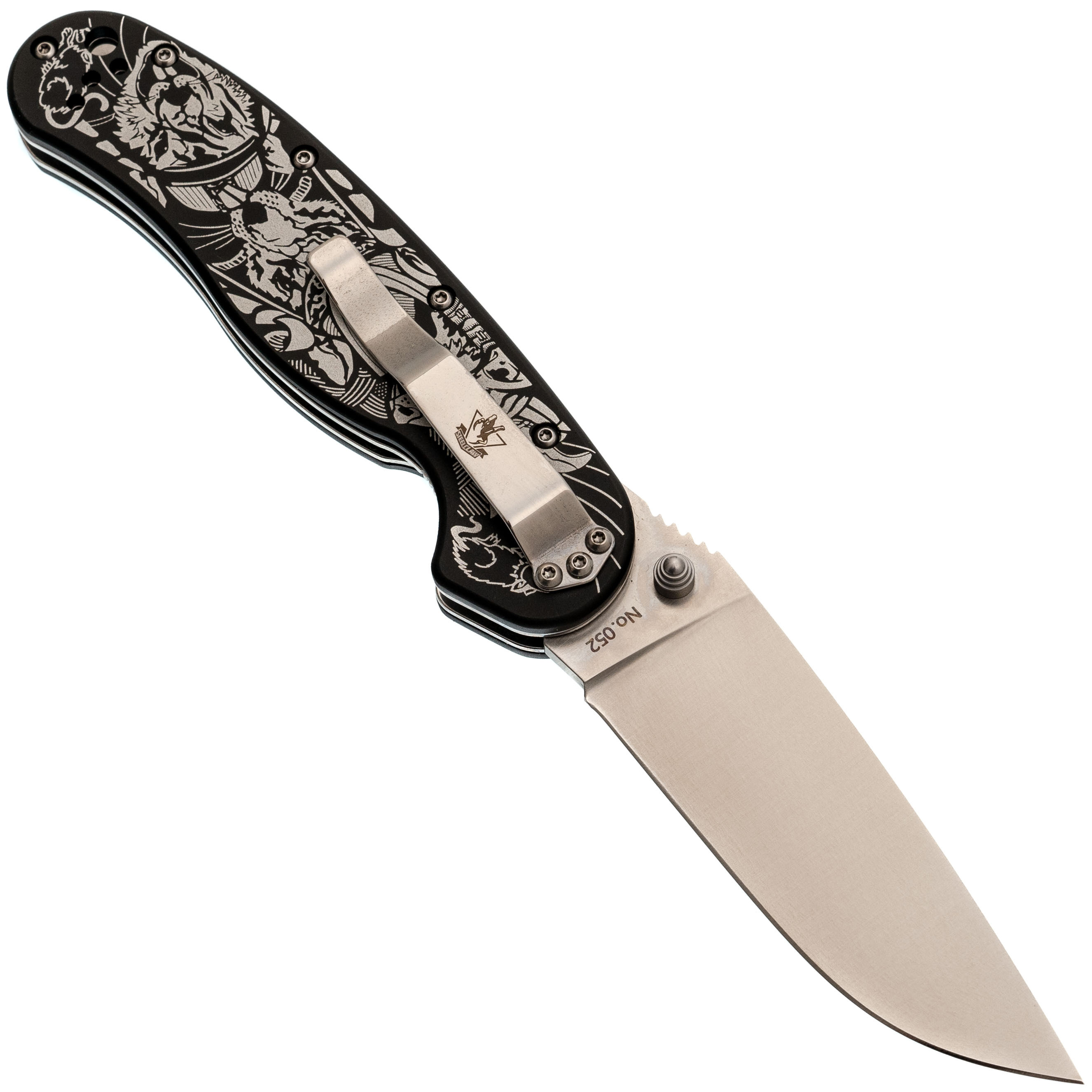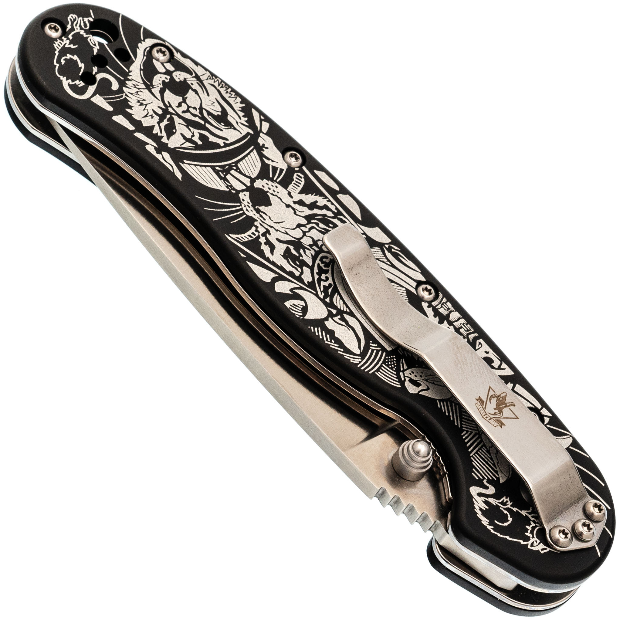 Эргономичный профиль с крупным упором страхует хват при продольных и поперечных нагрузках. Чёрный анодированный алюминий ощущается монолитно, а белая гравировка с самурайскими мотивами аккуратно отсылает к дисциплине формы без лишнего декора. Конструкция на стальных лайнерах добавляет уверенности при работе, а клипса, переставляемая во все четыре положения, позволяет найти идеальную посадку для любого пользователя. Лимитированная версия подчёркивает особый характер серии.