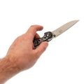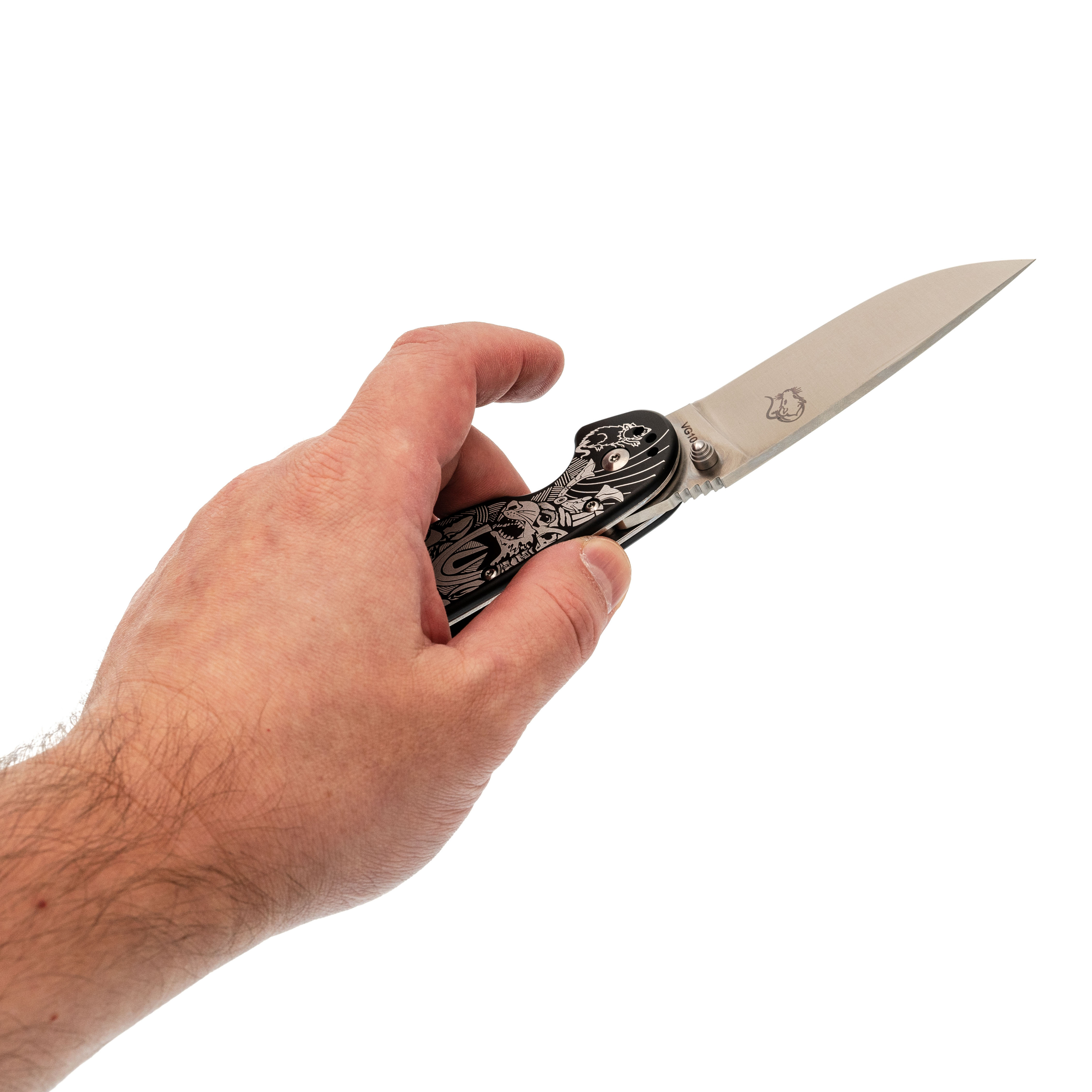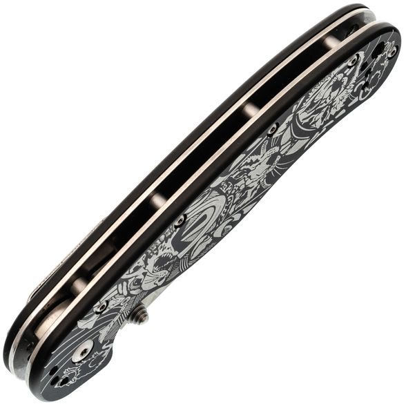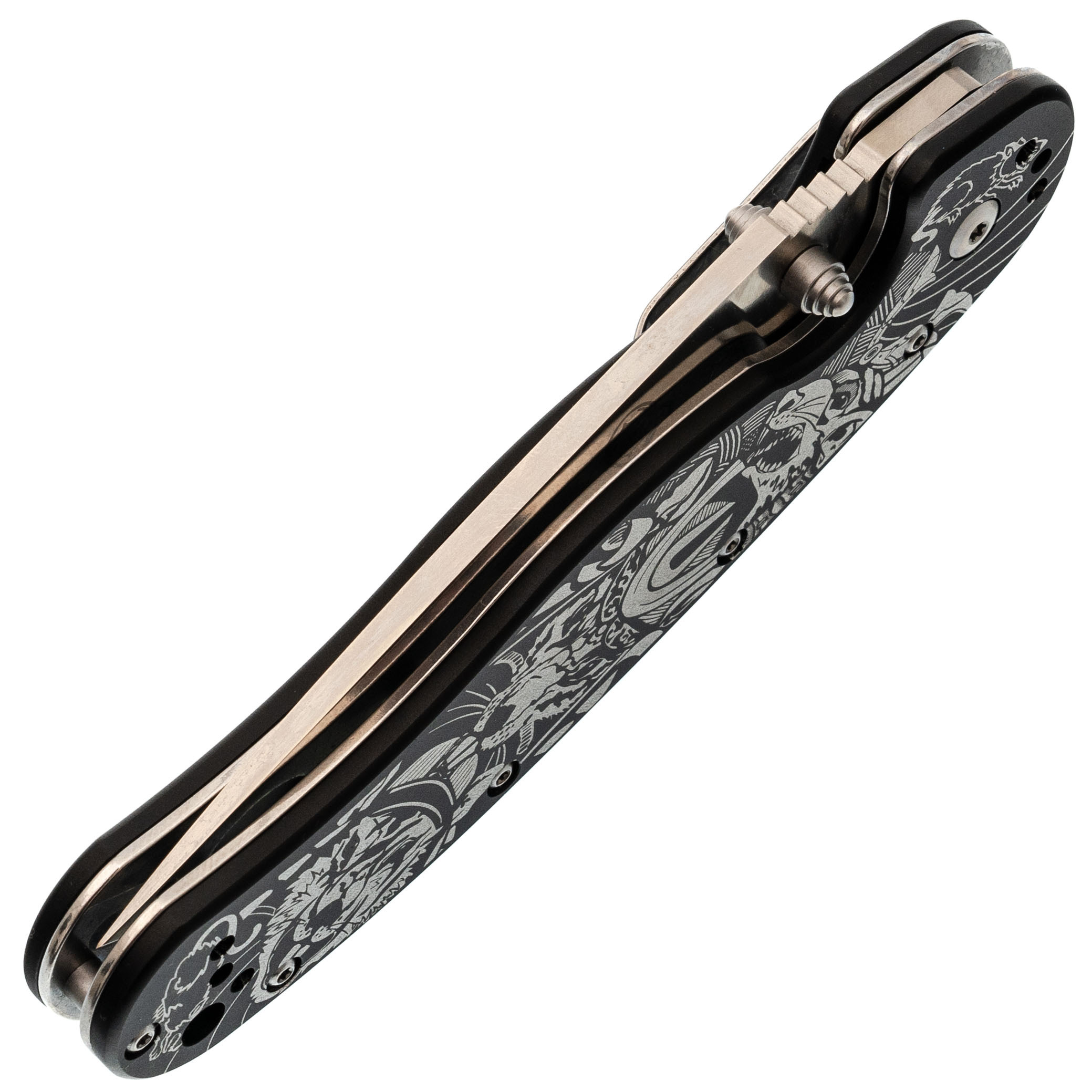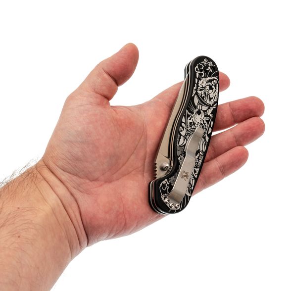 Эргономичный профиль с крупным упором страхует хват при продольных и поперечных нагрузках. Чёрный анодированный алюминий ощущается монолитно, а белая гравировка с самурайскими мотивами аккуратно отсылает к дисциплине формы без лишнего декора. Конструкция на стальных лайнерах добавляет уверенности при работе, а клипса, переставляемая во все четыре положения, позволяет найти идеальную посадку для любого пользователя. Лимитированная версия подчёркивает особый характер серии.