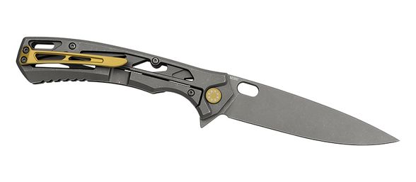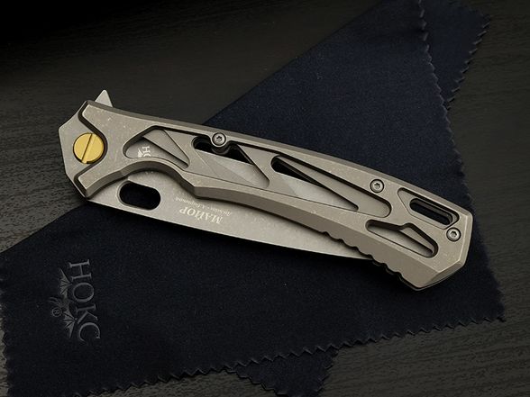 Рукоять выполнена из титана, материала, известного своей прочностью, лёгкостью и устойчивостью к коррозии, что делает его идеальным выбором для ножей премиум-класса. Эргономичная форма с продуманными облегчениями в конструкции обеспечивает надежный хват и комфорт при длительной работе. Для удобства переноски предусмотрены карманная клипса и темлячное отверстие. Конструкция замка Frame-Lock гарантирует максимальную безопасность, исключая риск случайного закрытия клинка во время работы.