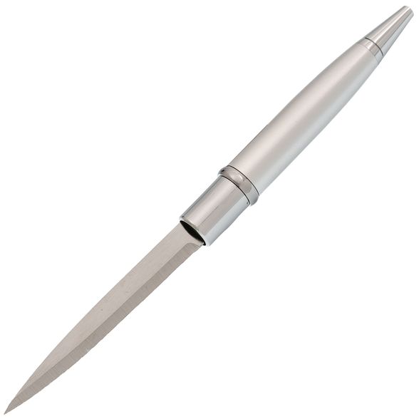 Лезвие ножа, спрятанное под защитным колпачком, имеет полусеррейторную заточку, что значительно повышает его функциональность. Такая заточка позволяет легко справляться не только с обычными задачами, но и эффективно перерезать волокнистые материалы, такие как веревки или ткань. Когда колпачок снят, основание ручки превращается в удобную рукоять, обеспечивая уверенный хват. Размер лезвия сравним с перочинным ножом, что делает его универсальным инструментом.