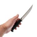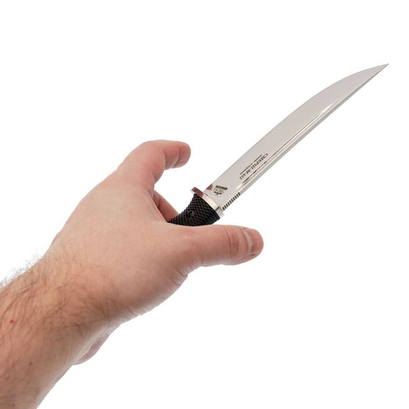 Рукоять выполнена из высокопрочного резинопластика, который обладает исключительной долговечностью и неприхотливостью в использовании. Эргономичная форма и специально разработанная текстура обеспечивают надежное сцепление, даже в условиях повышенной влажности или экстремальных температур. Сквозной монтаж рукояти гарантирует прочность и устойчивость конструкции, способствуя сохранению баланса ножа при динамичных нагрузках. Такой дизайн позволяет удобно и безопасно эксплуатировать инструмент в любых ситуациях.