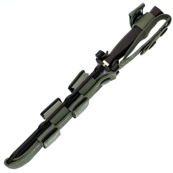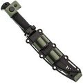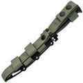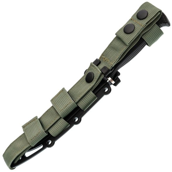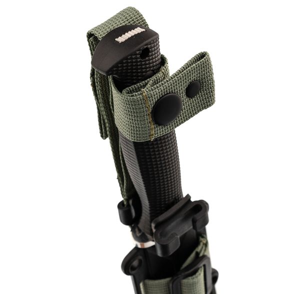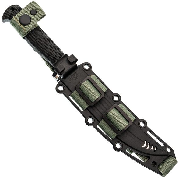 Ножны (футляр) изготовлены из современного материала – кайдекса, представляющего собой высокотехнологичный термопластик, идеально подходящий для создания легких и надежных аксессуаров. Материал обеспечивает надежное удержание ножа, даже если он перевернут рукоятью вниз, и устойчив к воздействию воды и резким температурным перепадам. Комплектация ножа дополнена системой ношения через стропу Molle, что позволяет удобно переносить его на поясе или рюкзаке. Такой подход к выбору материалов и способов ношения делает нож универсальным инструментом для любых условий эксплуатации.