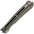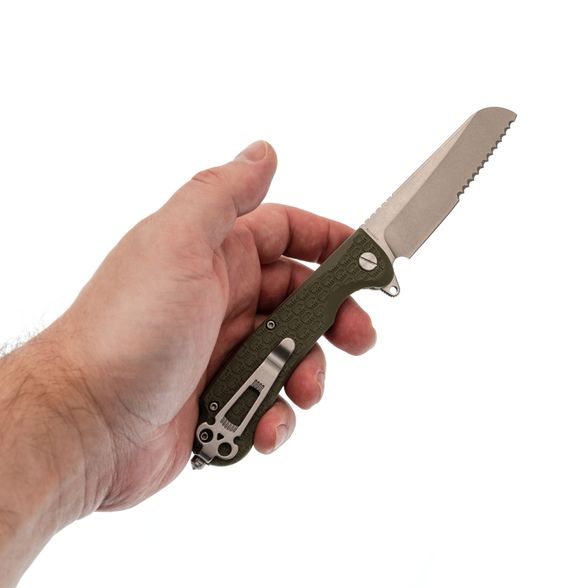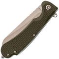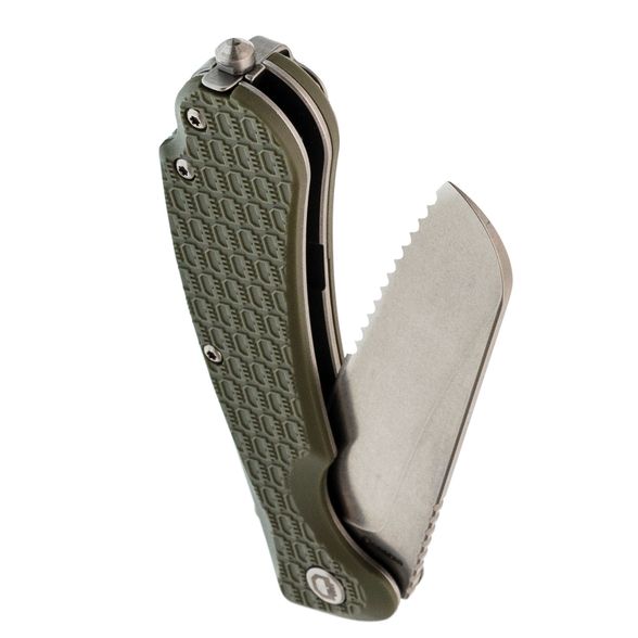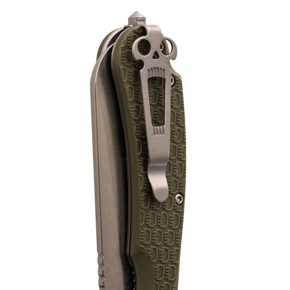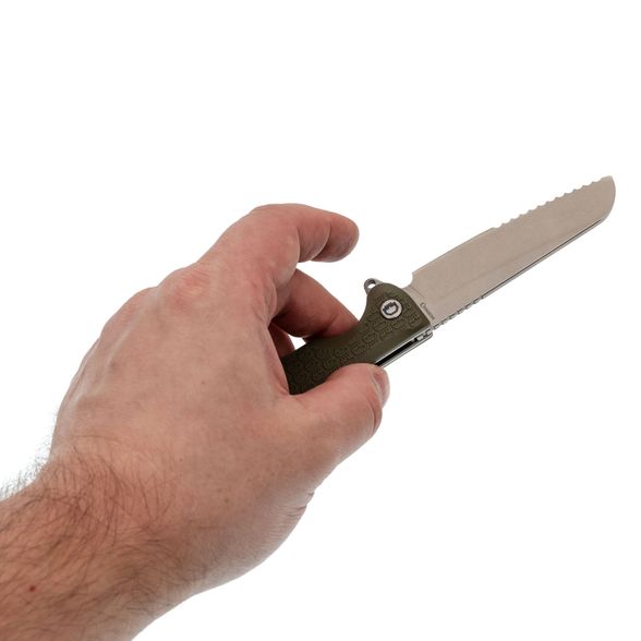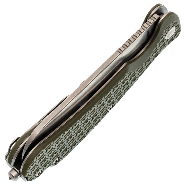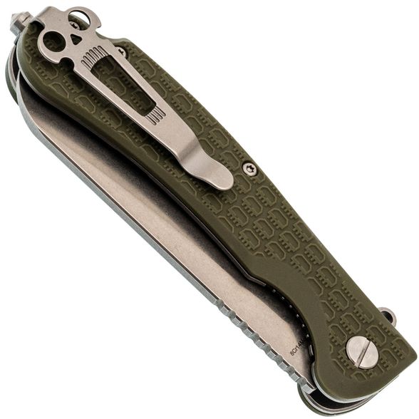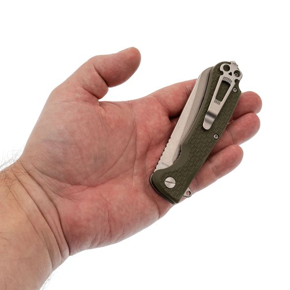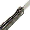 Конструкция рукояти выполнена по принципу сэндвич – основой являются стальные лайнеры, к которым крепятся накладки из FRN – материала, ценящегося за свою прочность, легкость и неприхотливость. Эргономичный дизайн, включающий плавный изгиб и подпальцевую выемку, гарантирует уверенный и комфортный хват, что значительно повышает удобство работы с ножом. Дополнительная надежность обеспечивается использованием замка Liner-Lock.