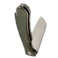 Сердцем этого ножа является клинок из стали 8Cr14MoV, известной своей способностью к легкому затачиванию, устойчивостью к коррозии и высокой ударной вязкостью – идеальный выбор для самых различных условий работы. Особое внимание заслуживает полусеррейторная заточка с серрейтором, расположенным на стороне кончика, что значительно облегчает нарезку продуктов и работу с острой частью инструмента, поддерживаемую профилем Sheepfoot.