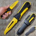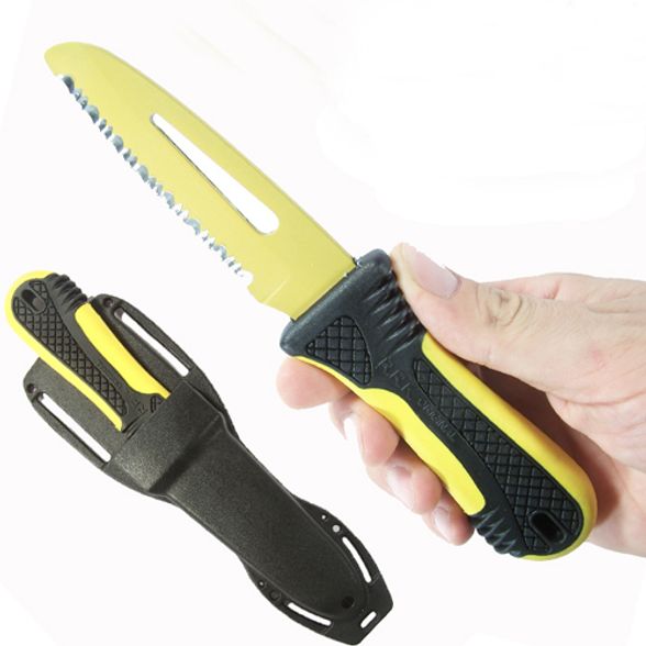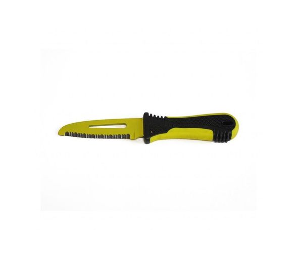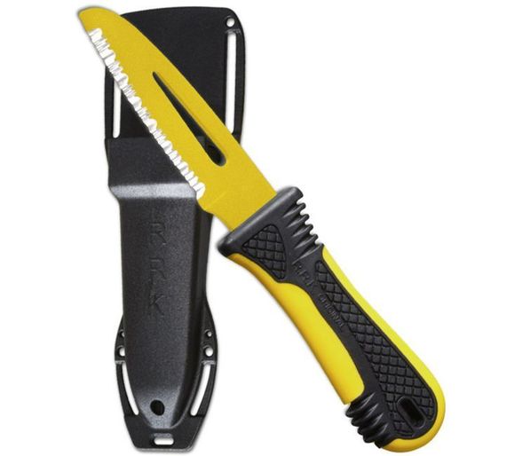 Спасательный нож для яхтсменов Fantoni, Race Rescue пригодится всем любителям бороздить морские просторы под парусом. Клинок выполнен из высокоуглеродистой стали AISI 425 с хорошими показателями антикоррозийности и режущими свойствами. Лезвие имеет серрейторную заточку и профиль Sheepfoot blade с закругленным безопасным концом. Такая конструкция идеально подходит для разрезания веревок и канатов. На металл нанесено тефлоновое покрытие необычного ярко-желтого оттенка. Нож для моряков и яхтсменов оснащен удобной ребристой рукоятью из термопластика GRN, которая хорошо удерживается даже в мокрой ладони. В рукояти расположено отверстие для ремня или страховочного корда. Комплект дополнен защитным пластиковым чехлом.