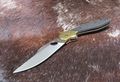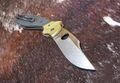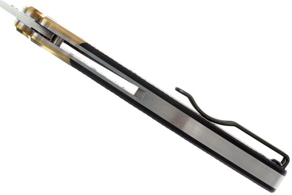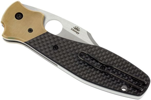 Клинок Schempp Bowie C190CFP, формы Clip Point с гладкой заточкой, изготовлен из нержавеющей стали CPM-S30V самого высокого качества. Больстеры из желтой меди с обоих сторон рукояти имеют упоры для пальцев, и таким образом исполняют функции гарды, то есть защищают ладонь владельца от случайных увечий или от соскальзывания кисти на лезвие. Остальная часть рукояти Bowie C190CFP выполнена из углеродного волокна на подложке из G-10 черного цвета, переплетенного в стильном узоре, что добавляет ножу немного современного лоска. Эта модель использует стальную раму, с расположенным на ней механизмом фиксации лезвия Liner Lock. Также на рукояти присутствует съемная переставляемая, под правую или под левую руку клипса, положения Tip-Up, сконструированная для ношения глубоко в кармане.