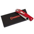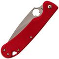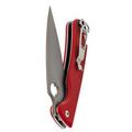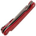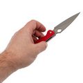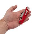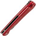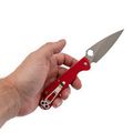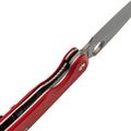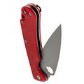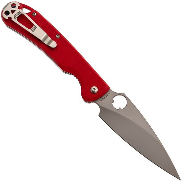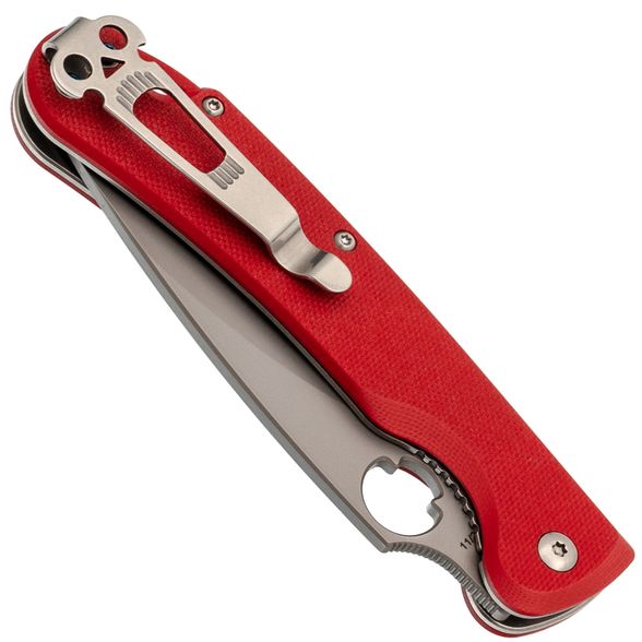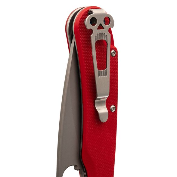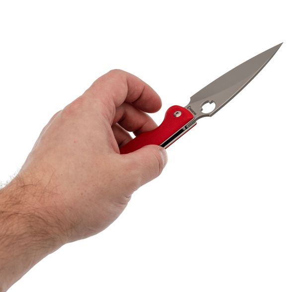 Рукоять выполнена из прочного и лёгкого стеклотекстолита G10, который обладает высокой влагостойкостью. Ярко-красный цвет и цепкая текстура обеспечивают надёжное удержание в руке даже в сложных условиях. Эргономичная форма с подпальцевой выемкой добавляет комфорта и безопасности в использовании.