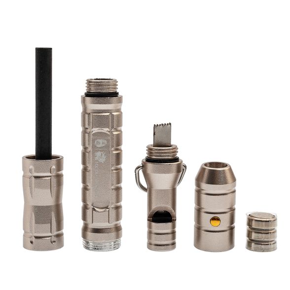 Свисток туристический для выживания MK2 Grey - незаменимый аксессуар для любителей экстремального отдыха от компании HX OUTDOORS. Туристический edc свисток для выживания оснащен корпусом из прочного титанового сплава. Благодаря прорезиненным уплотнительным кольцам он полностью защищенным от попадания влаги. Многофункциональный свисток для выживания состоит из нескольких частей, каждая из которых откручивается отдельно. Поверхность мультитула имеет ребристую текстуру, поэтому свисток, огниво и пила надежно фиксируются даже в мокрой в руке. Небольшое кольцо позволяет закрепить свисток на куртке, лямке рюкзака или ремне.